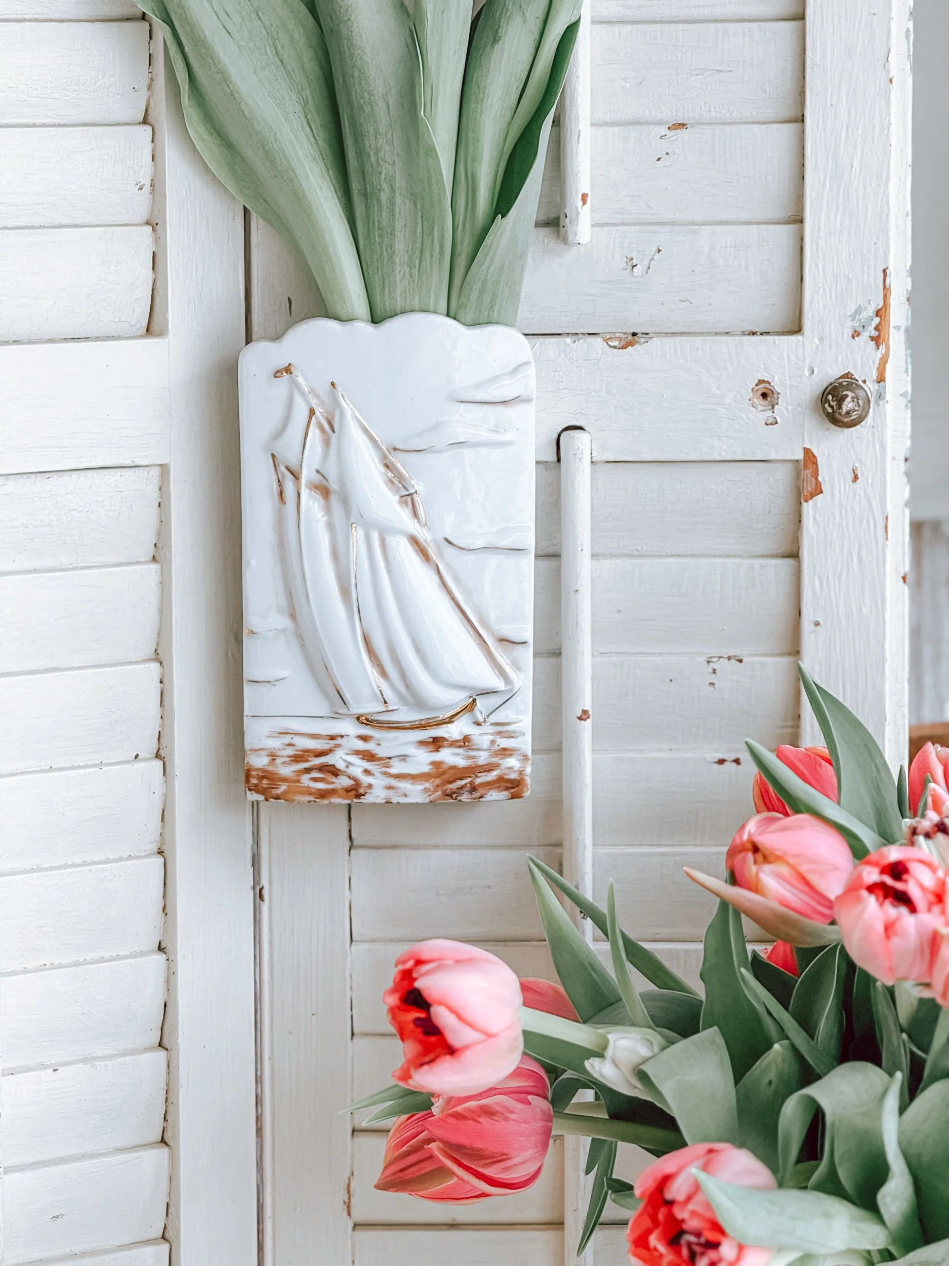 This vintage porcelain wall pocket features a softly raised sailboat drifting across a calm surface — subtle, textural, and full of movement.