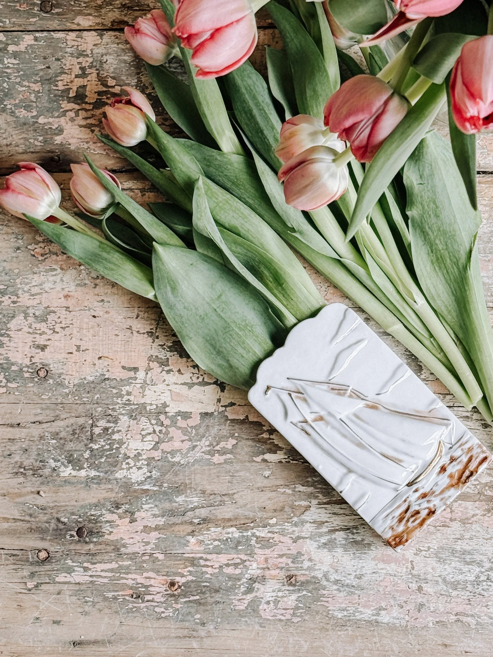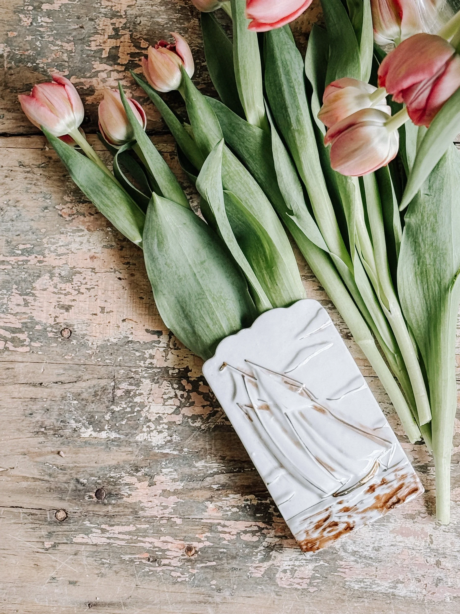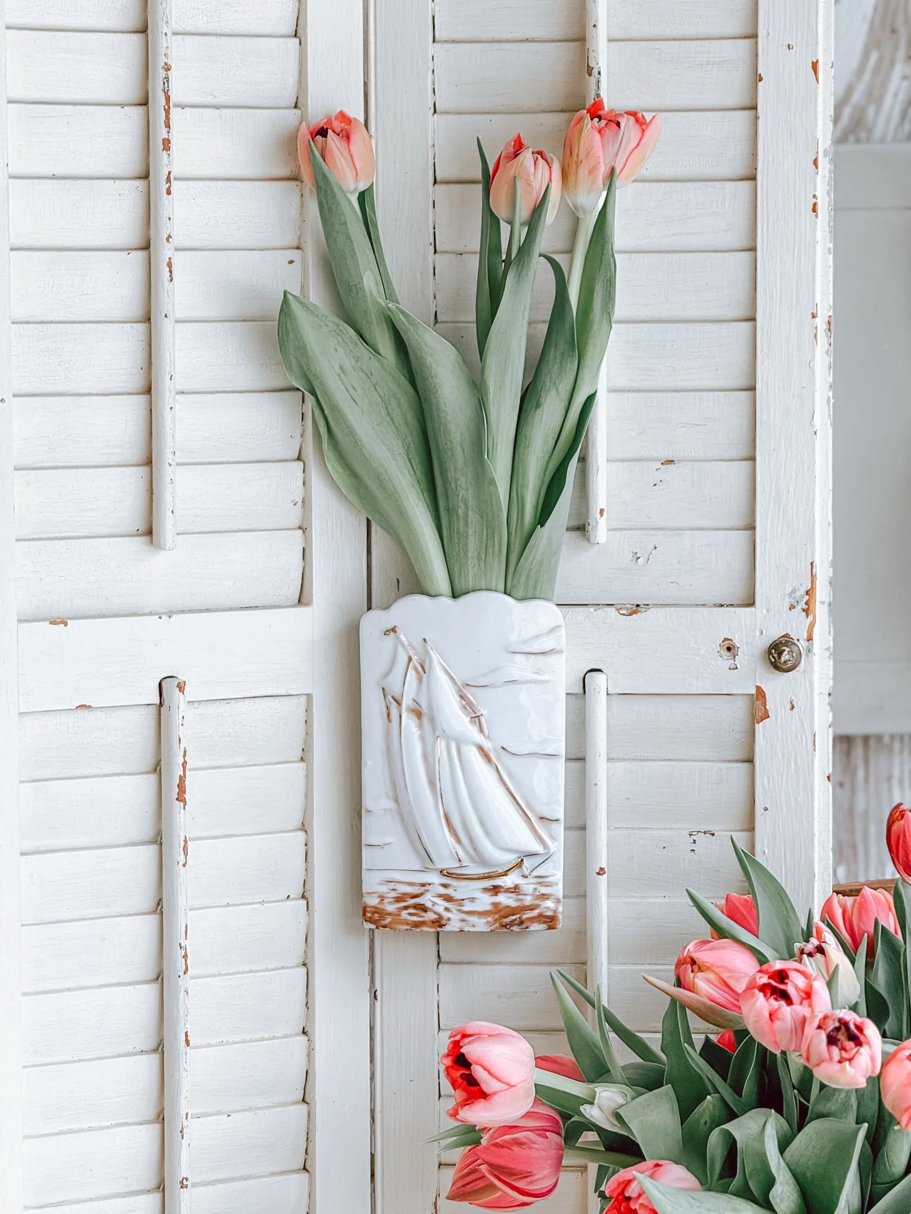 Finished in a creamy white glaze with gentle, timeworn patina gathering along the base, it carries that perfectly imperfect character we’re always searching for. Meant to be hung and filled, it transforms effortlessly with the seasons — fresh tulips in spring, wild clippings in summer, or dried stems through the colder months.