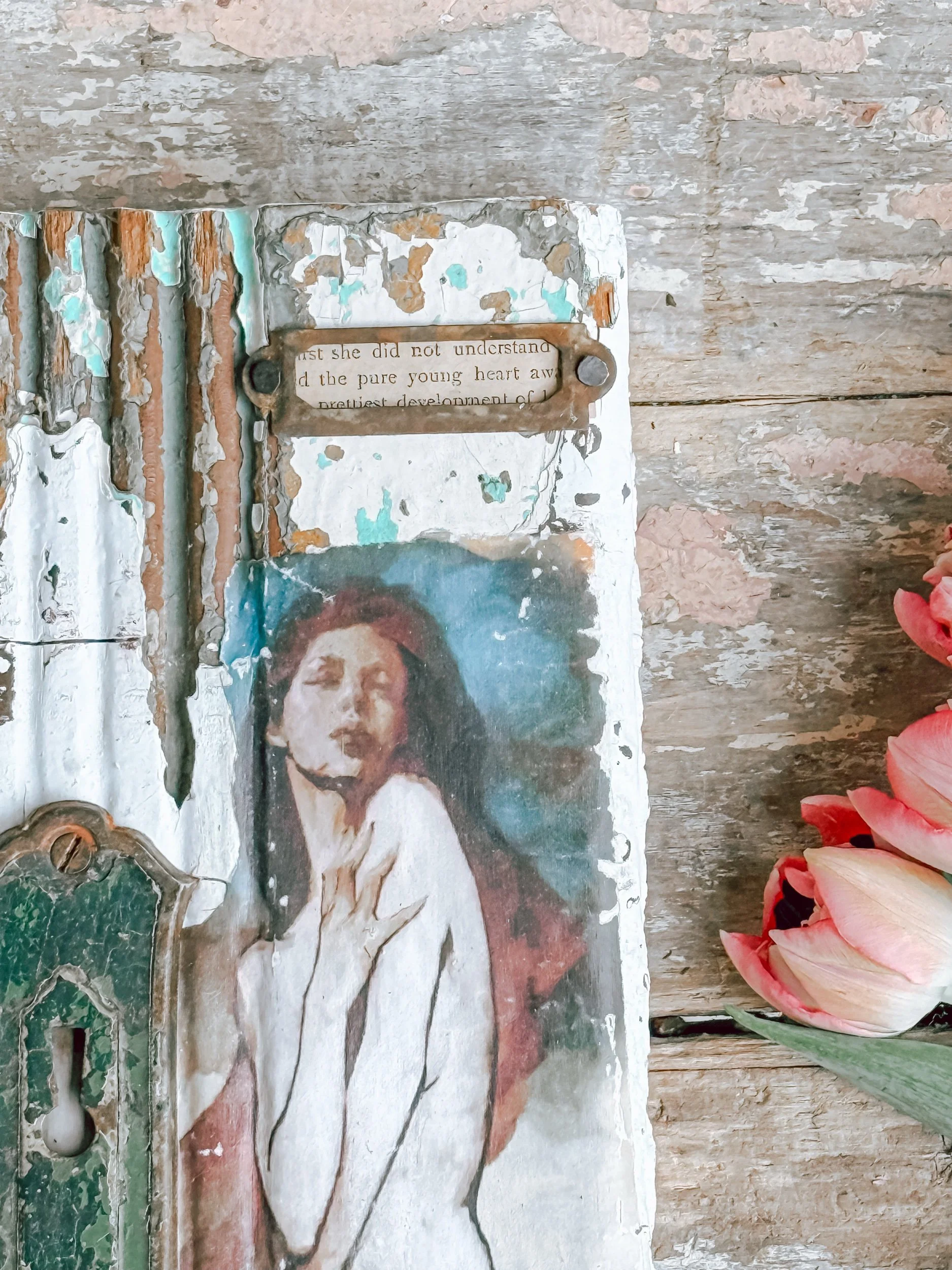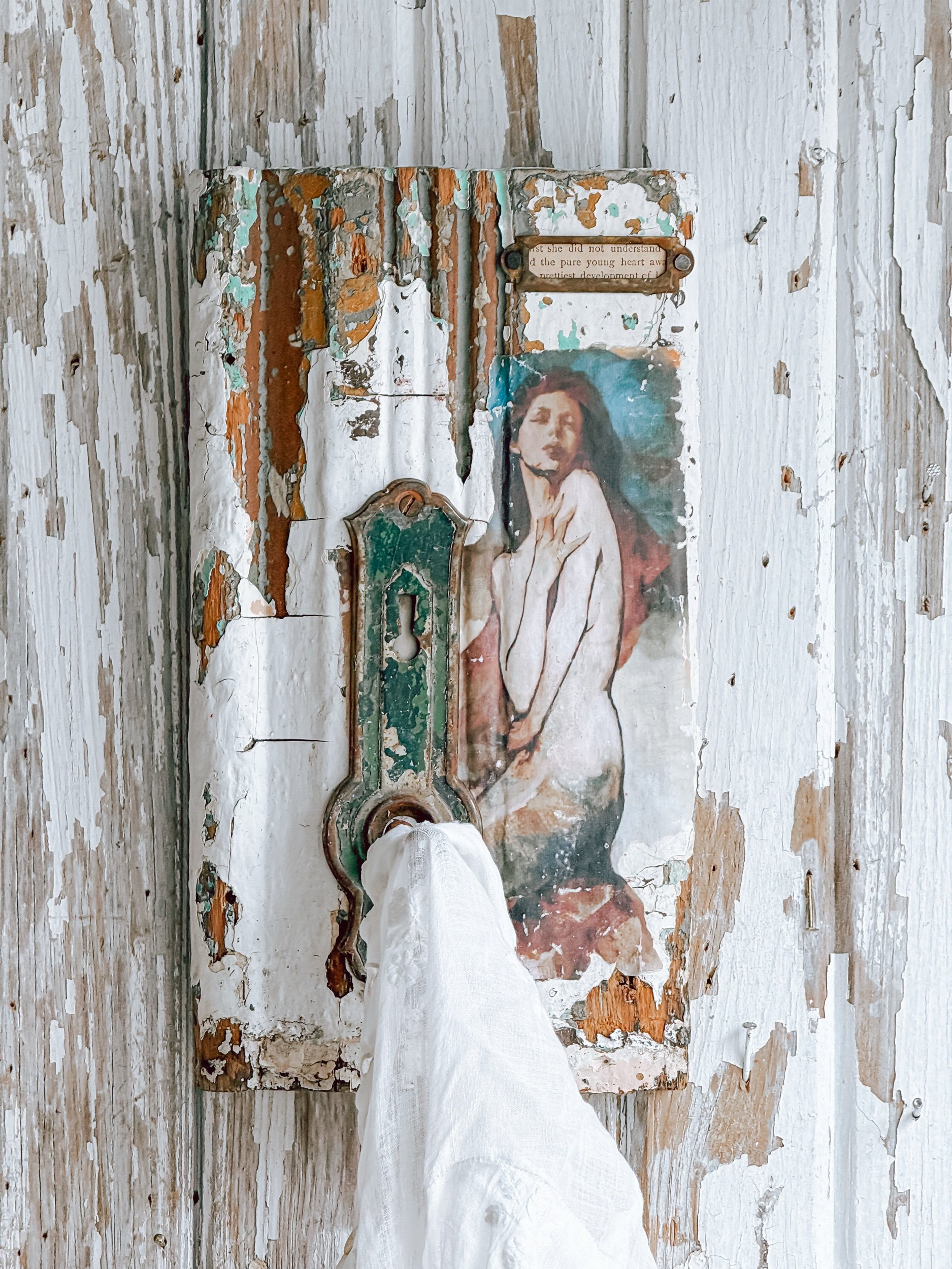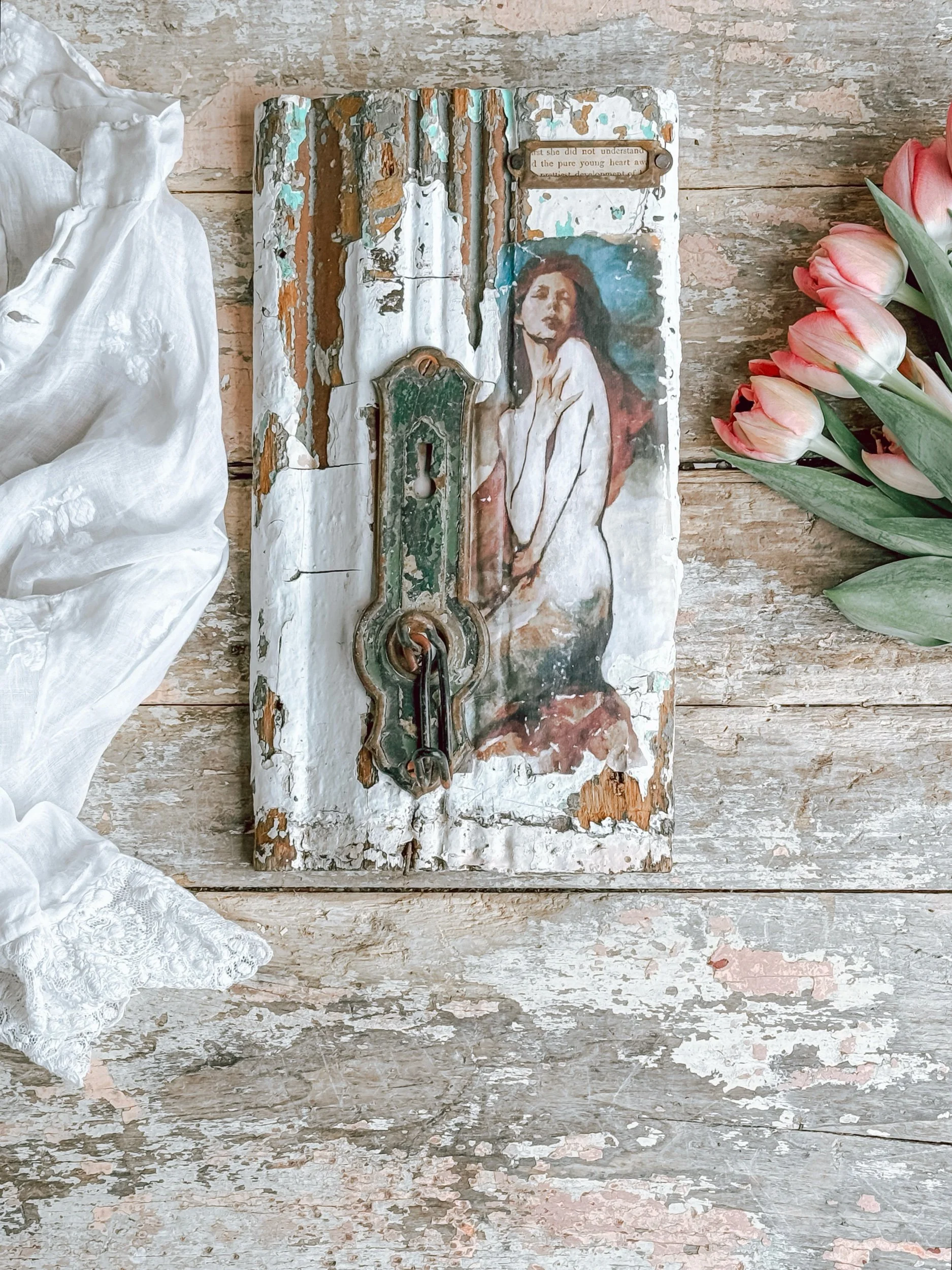 This artisan handmade wall hook is created from salvaged materials, featuring beautifully aged patina, worn paint, and a timeworn metal hook. The surface carries layers of character — chipped, softened, and imperfect in the most intentional way.
