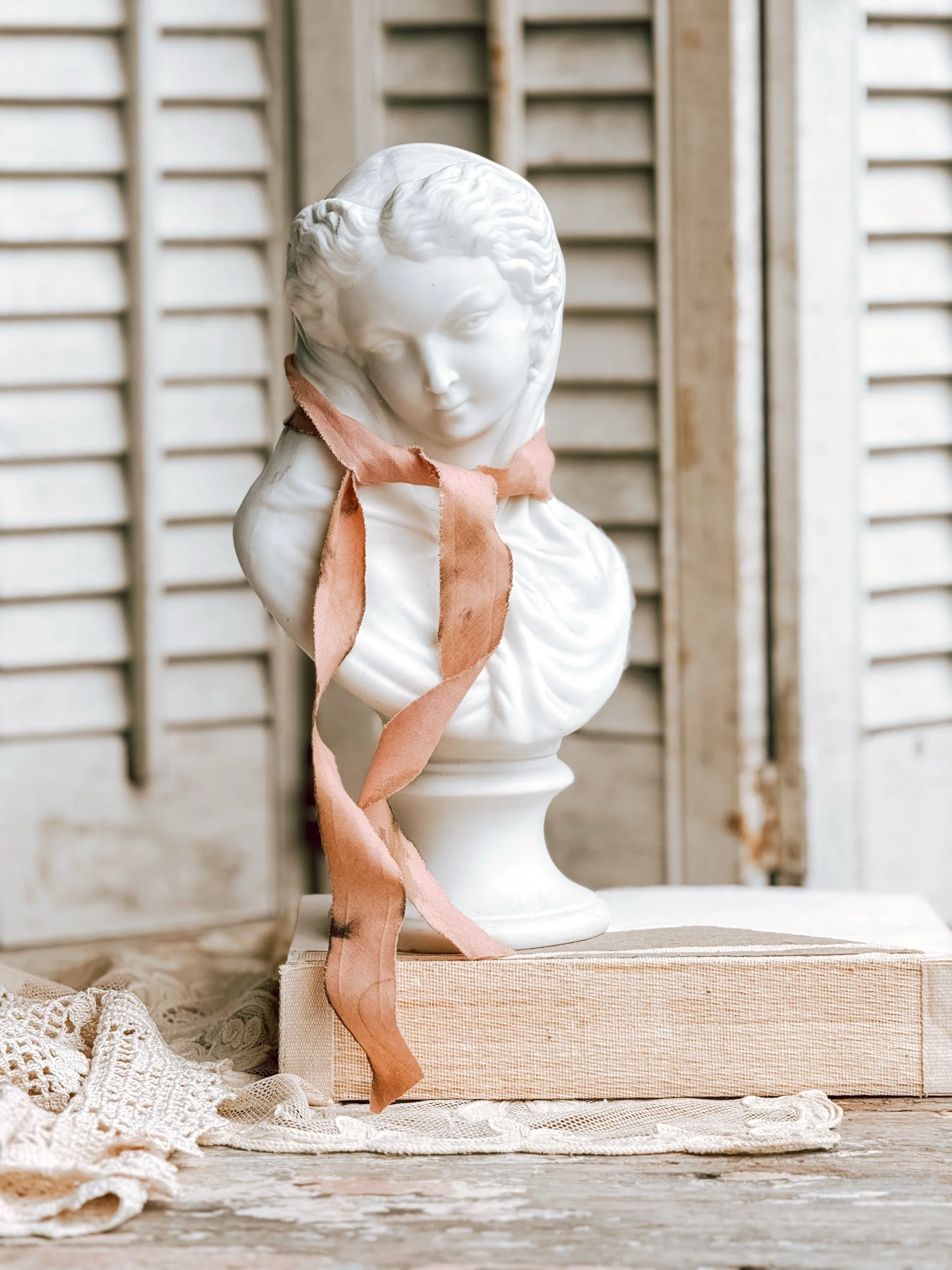 Finished with a hand-dyed pink ribbon for a subtle touch of color and femininity, perfect for styling within a vignette, on a stack of books, or tucked into a shelf among collected pieces.