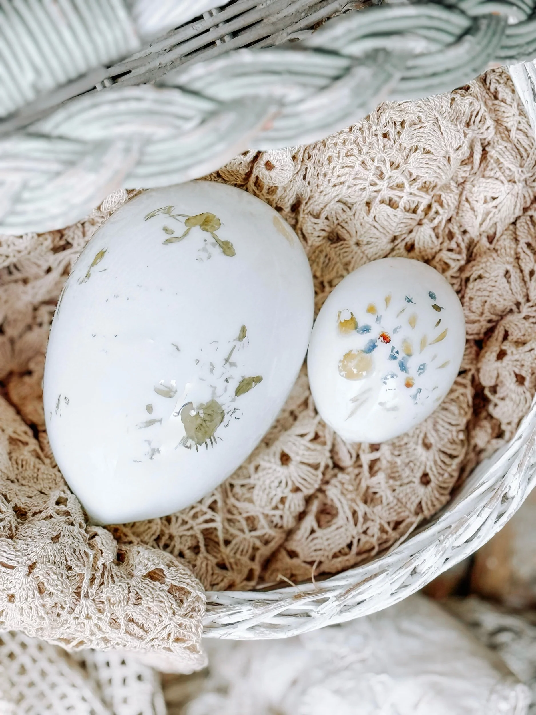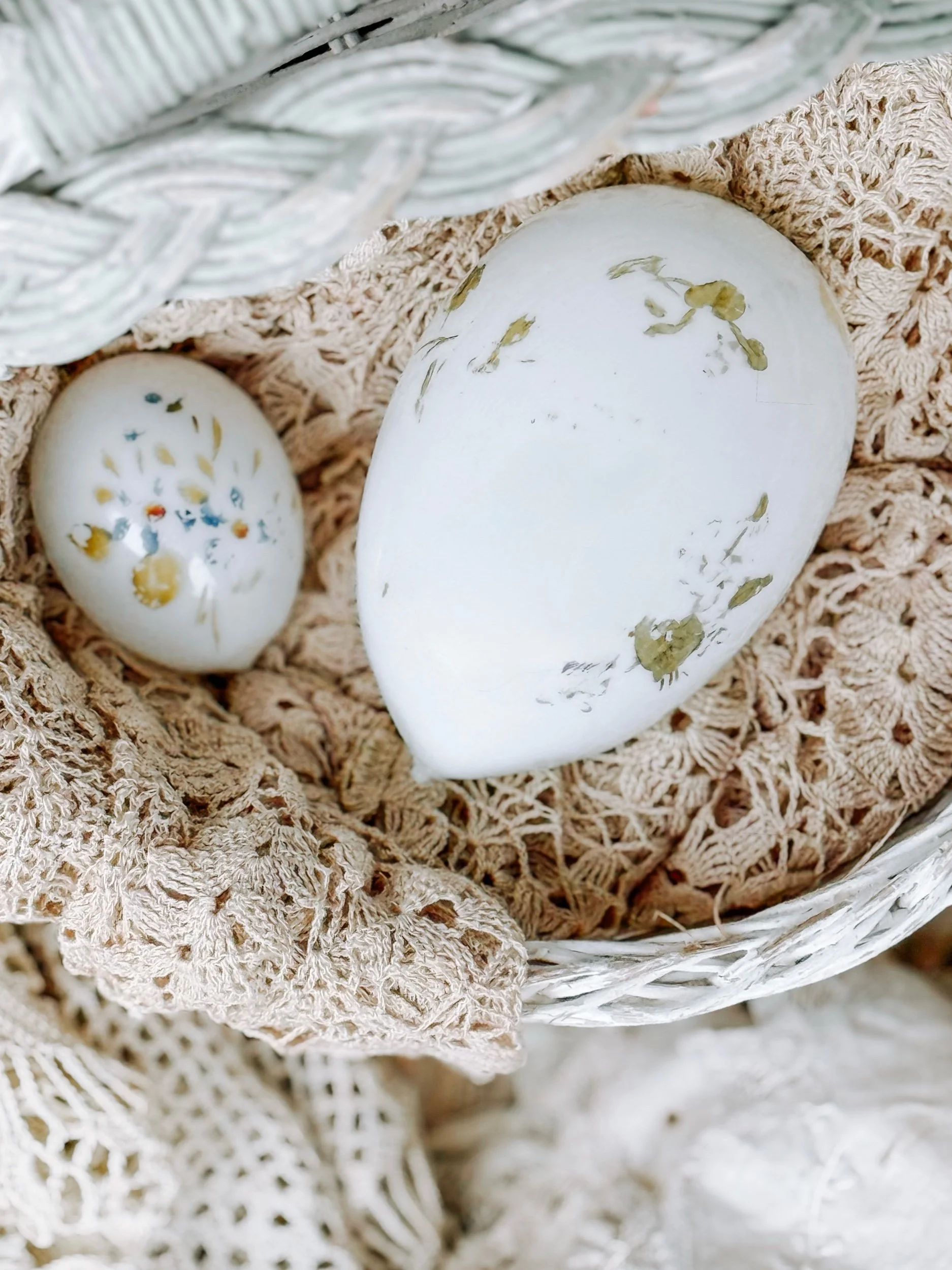 A beautifully unique pair of antique Victorian porcelain eggs, each featuring soft matte finishes with timeworn markings and delicate floral remnants. Unlike the previous set, these carry traces of hand-applied botanical detail — faded blooms and gentle pigment that feel almost ghostlike with age.