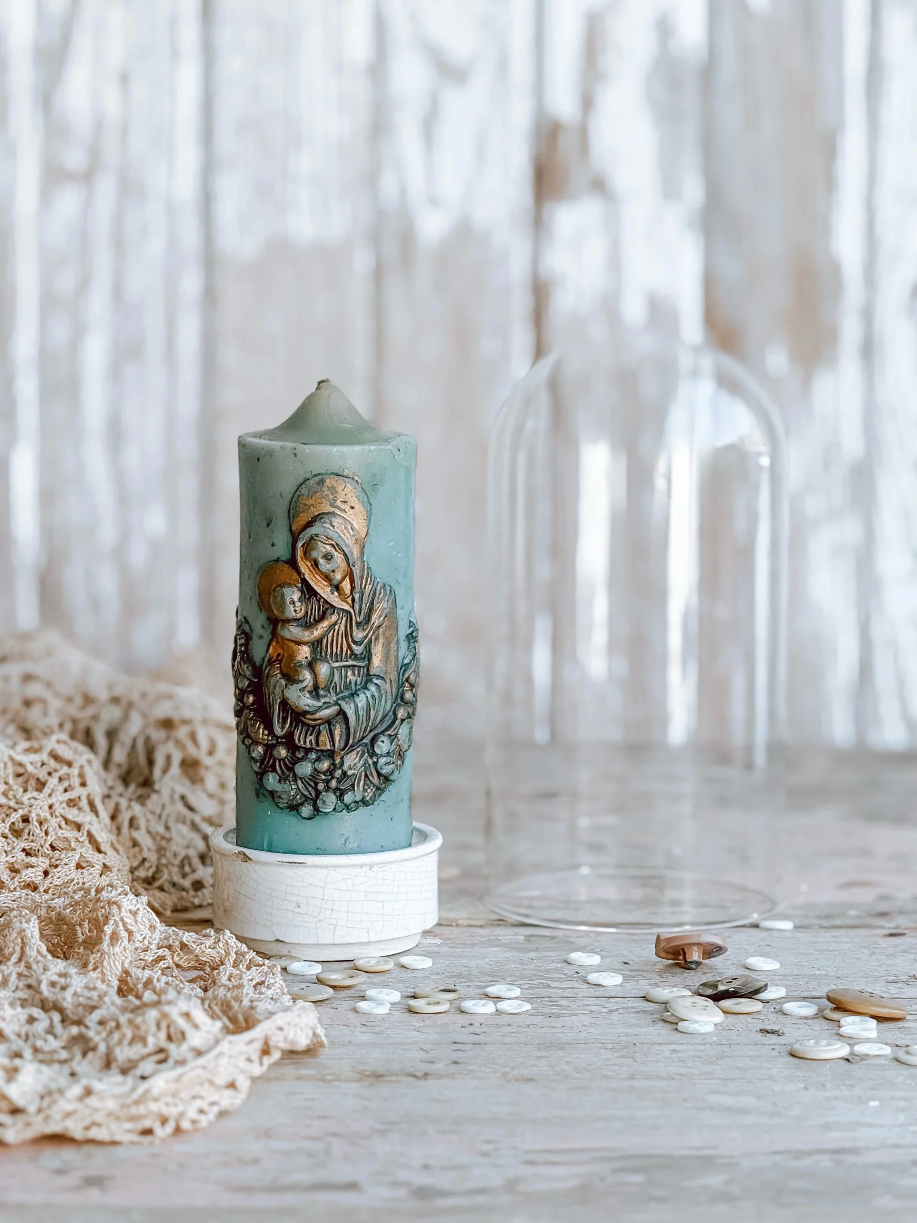 The candle shows gentle age and character, adding depth and authenticity to the piece. When placed beneath the cloche, it becomes a quiet focal point — perfect for a shelf, side table, or devotional vignette.
