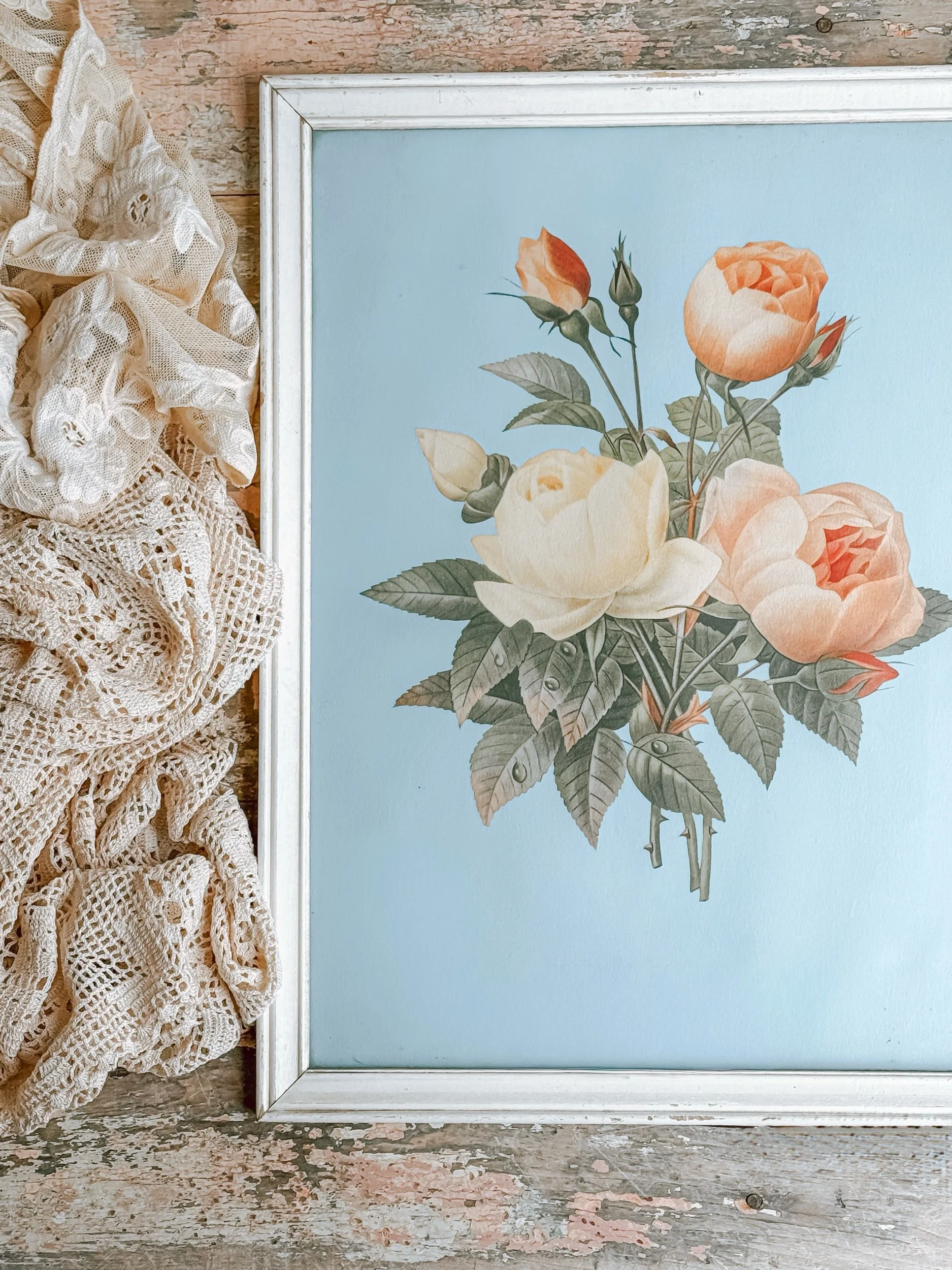 Perfect for layering into a gallery wall, styling above a dresser or bedside, or leaning on a shelf among ironstone, books, and gathered objects. It brings a touch of softness and subtle color to any space, especially when paired with linens, natural wood, and fresh or dried florals.
