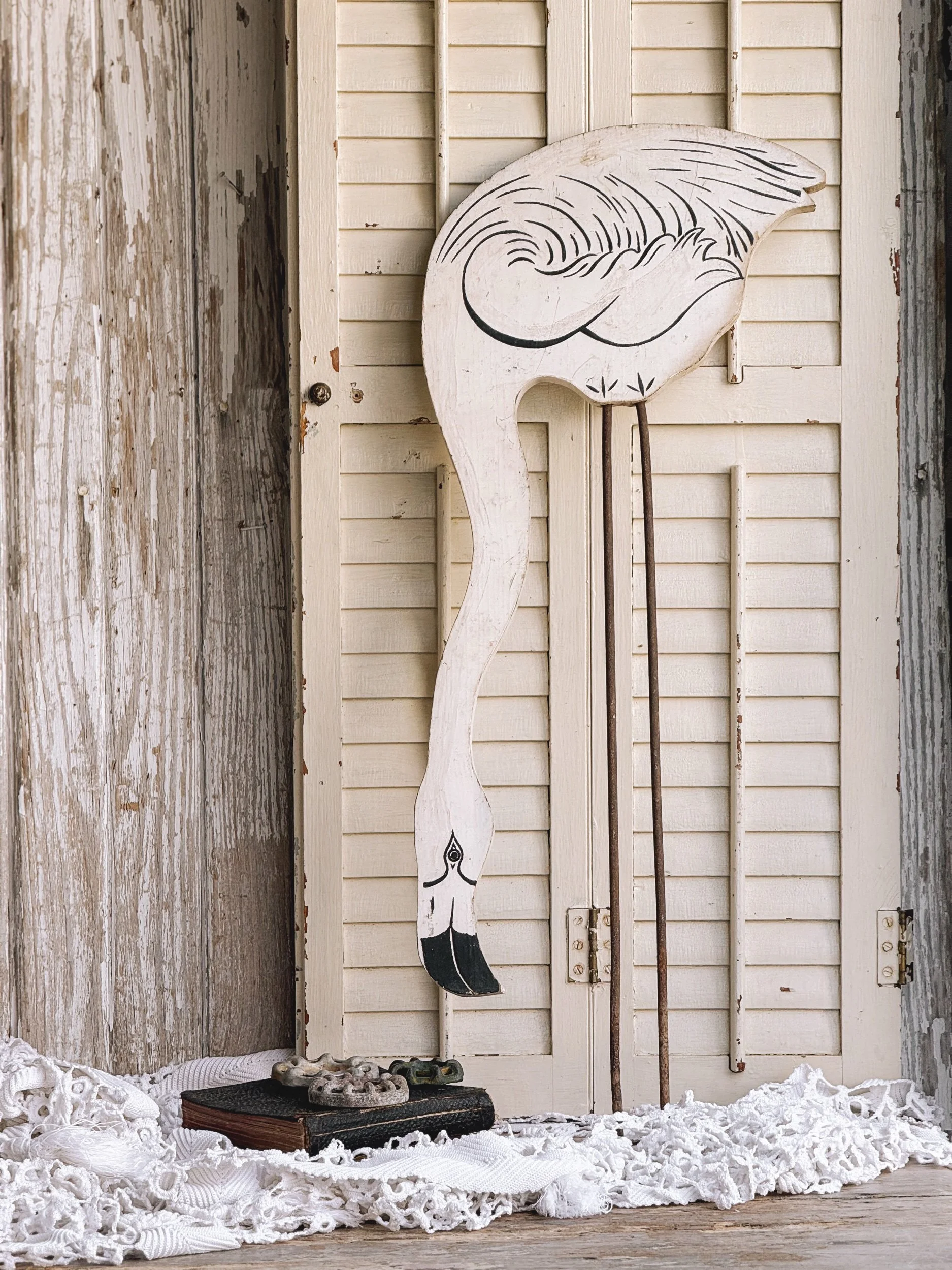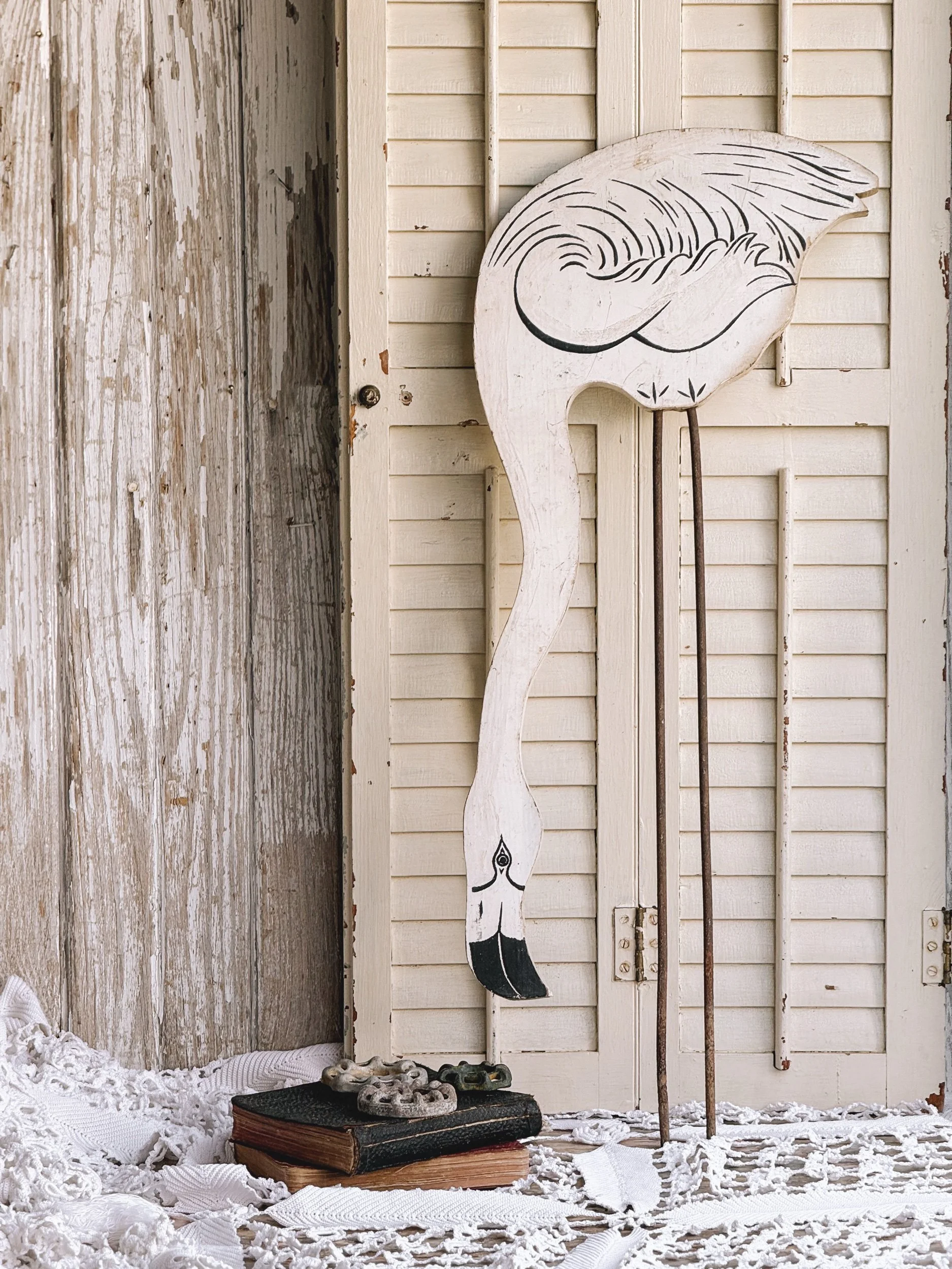 A beautifully aged vintage wooden flamingo with the most charming presence and quiet character. Hand-painted and double-sided, this piece features soft, timeworn detailing and stands gracefully on slender iron legs.