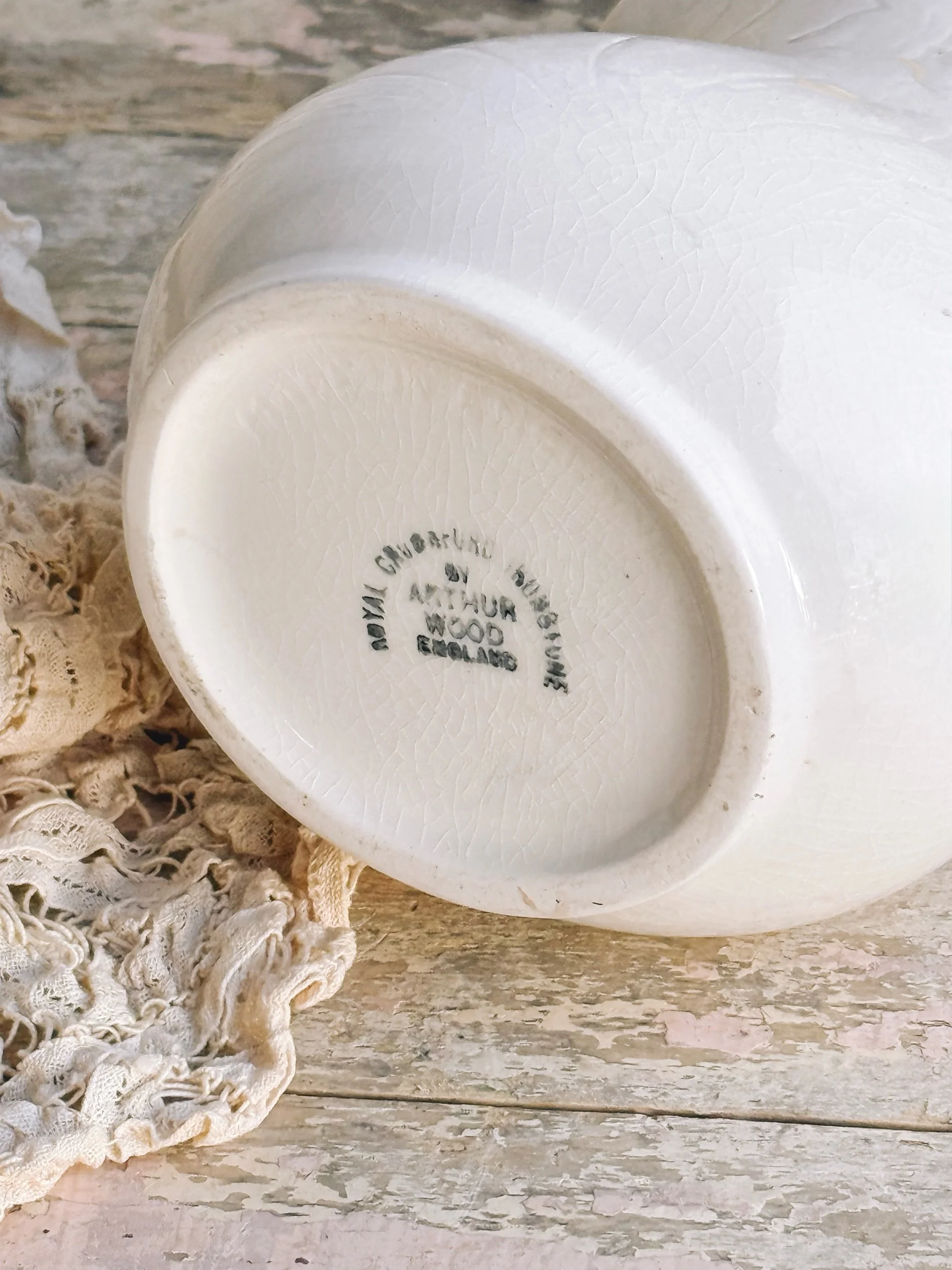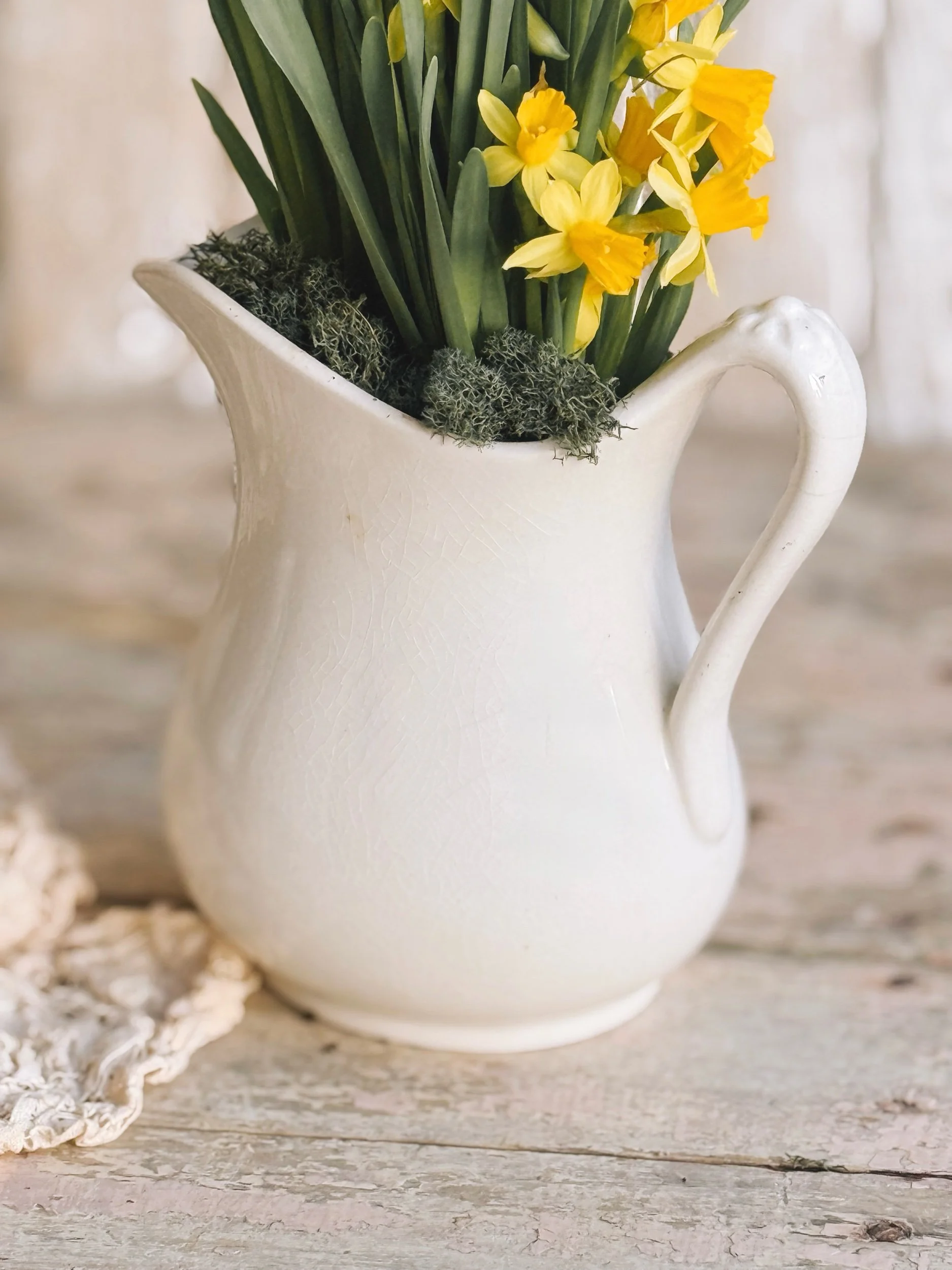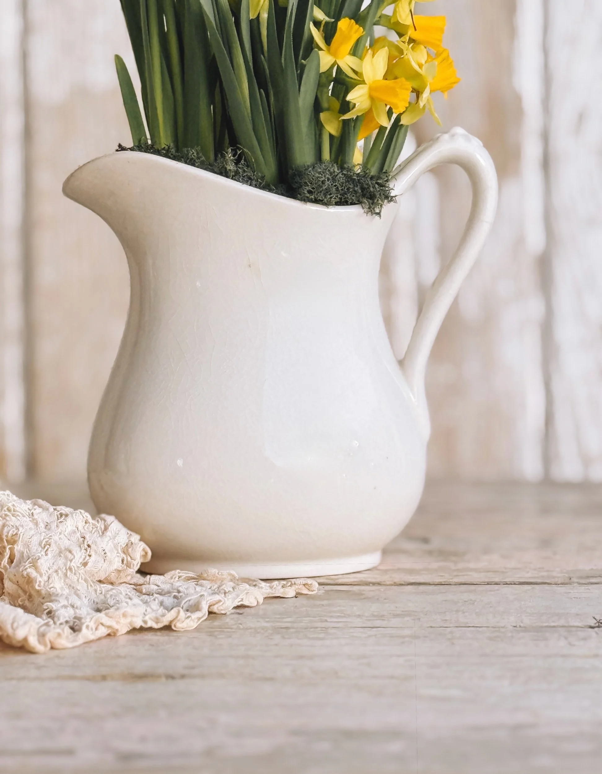 A timeless antique European ironstone pitcher with a softly curved silhouette and classic form. The creamy white glaze is accented by gentle crazing throughout, adding depth, texture, and a sense of history to the piece.