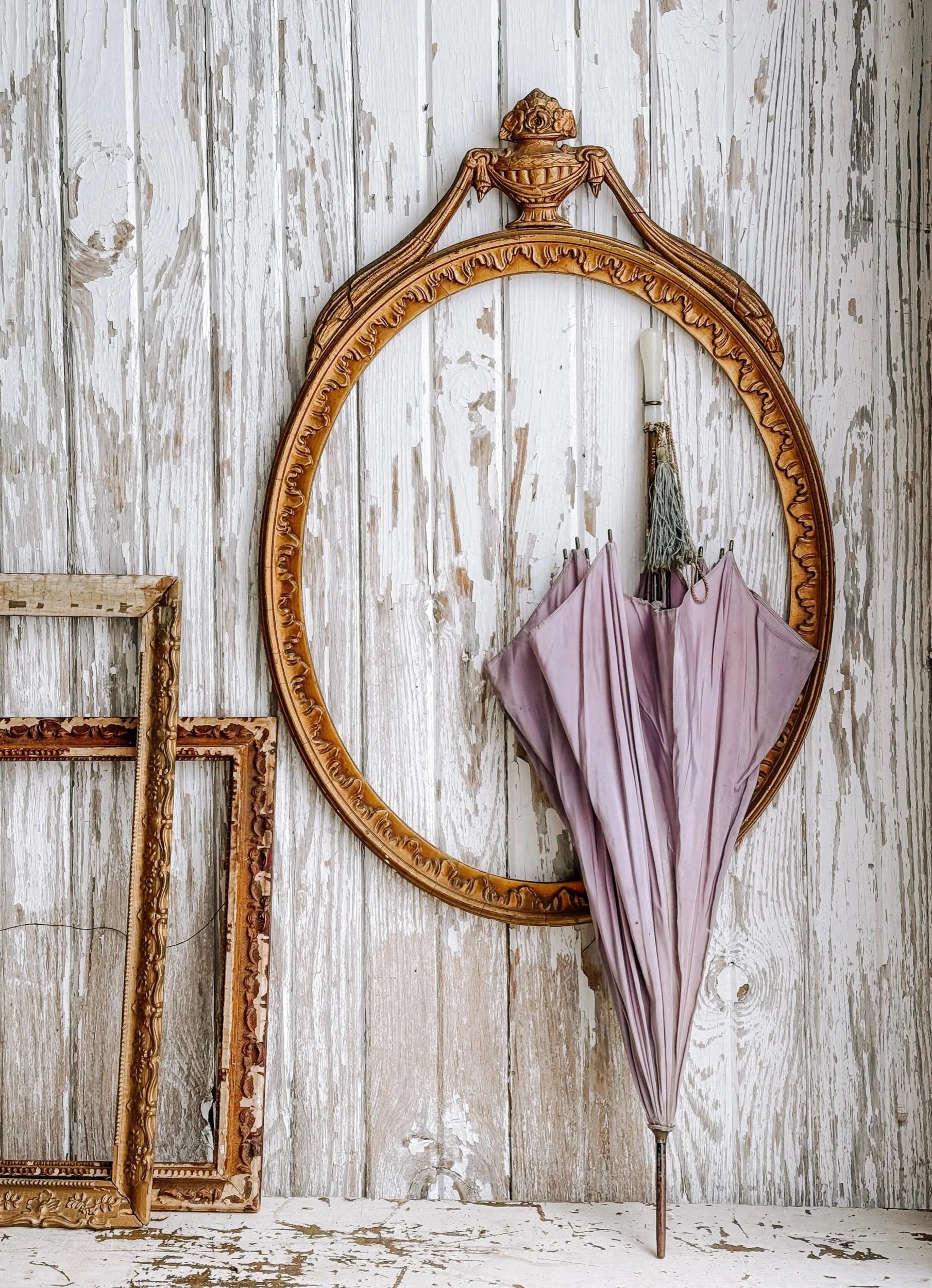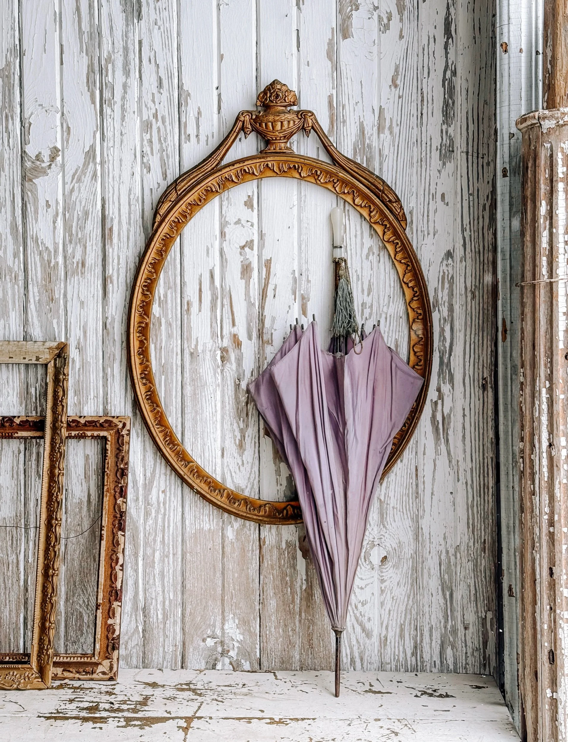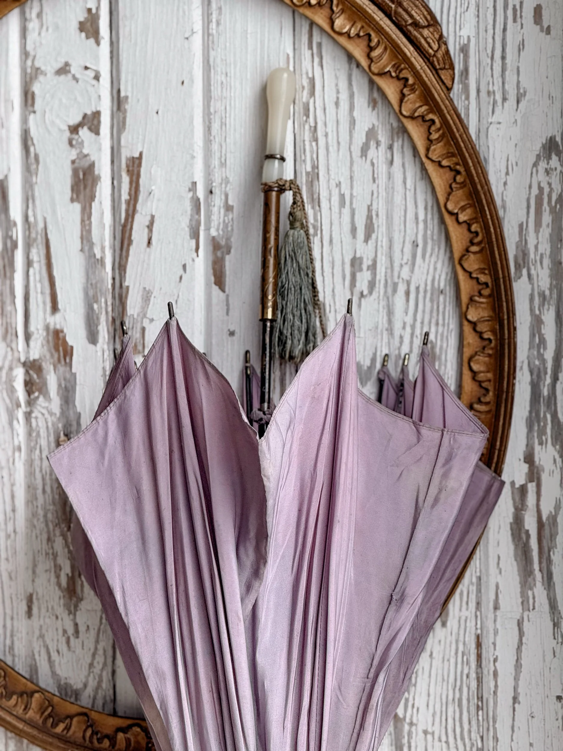 A stunning antique parasol in a lovely lilac color with pale blue fringe, making this a unique piece to display in any vintage inspired space.