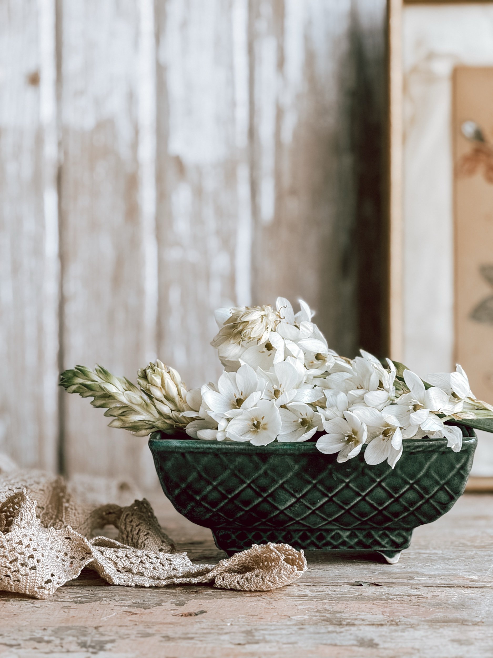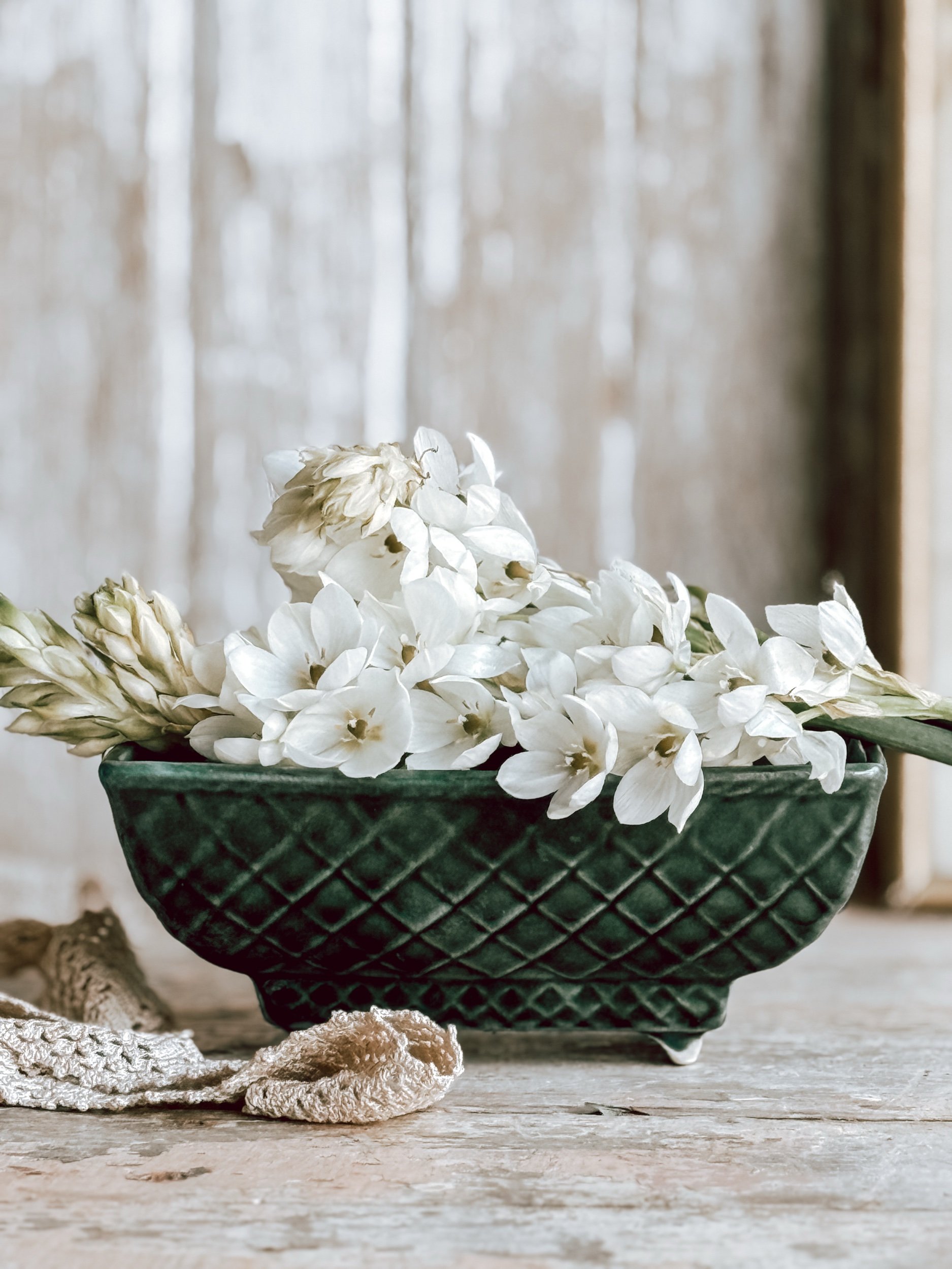 A beautifully aged pottery planter in a deep emerald glaze, featuring a classic diamond pattern that adds texture and quiet structure.
