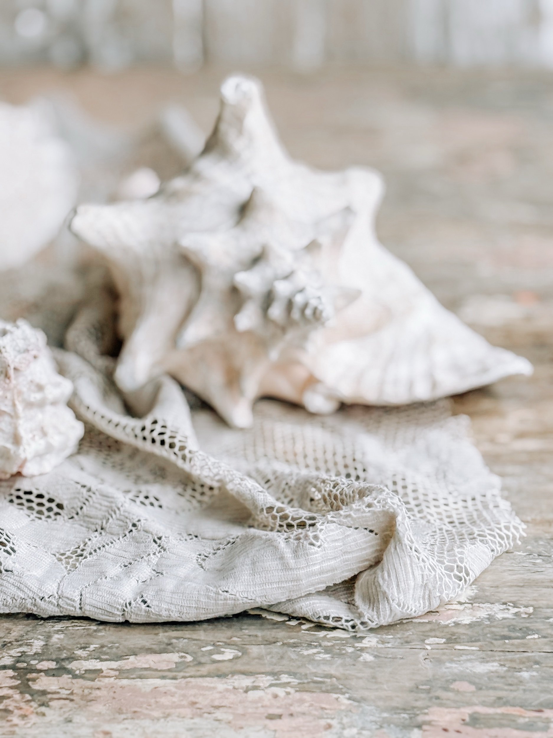 A striking collection of oversized vintage sea shells layered with antique lace.