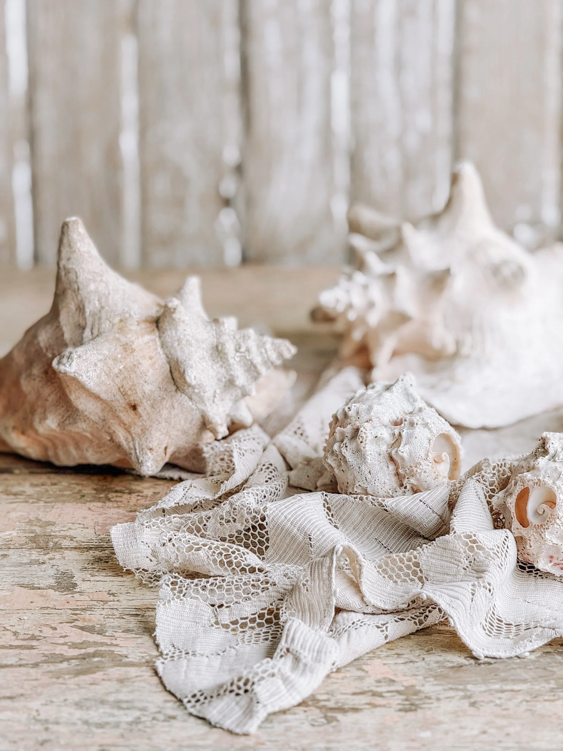 This grouping includes three substantial statement shells (approximately 10 inches), two smaller textured shells (approximately 5 inches), and a piece of antique lace for soft, romantic layering.
