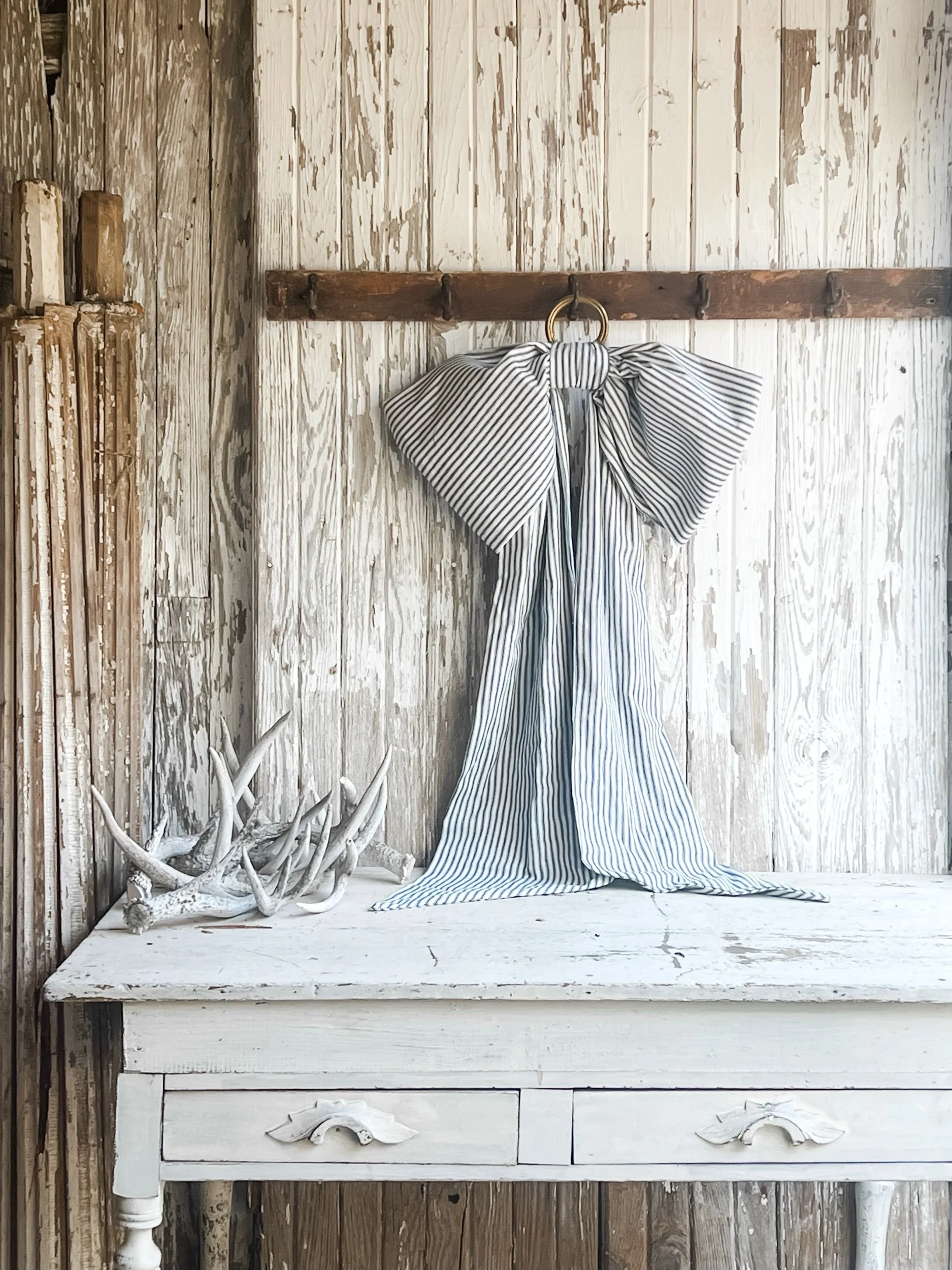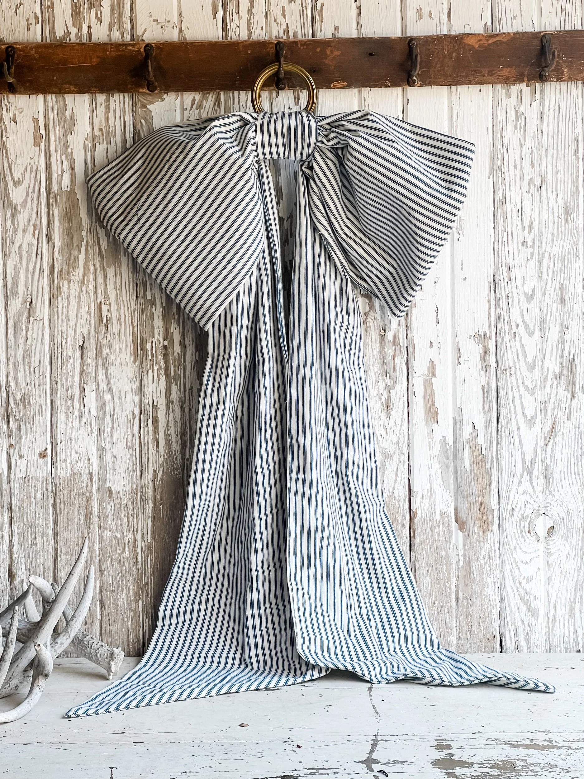 A gorgeous large handmade navy blue & white antique ticking stripe bow, oversized, perfect to add to your holiday garlands, swags, oversized wreaths, tree topper or your favorite door as a simple and festive touch to your home this holiday season. Made to order. Antique French brass ring included