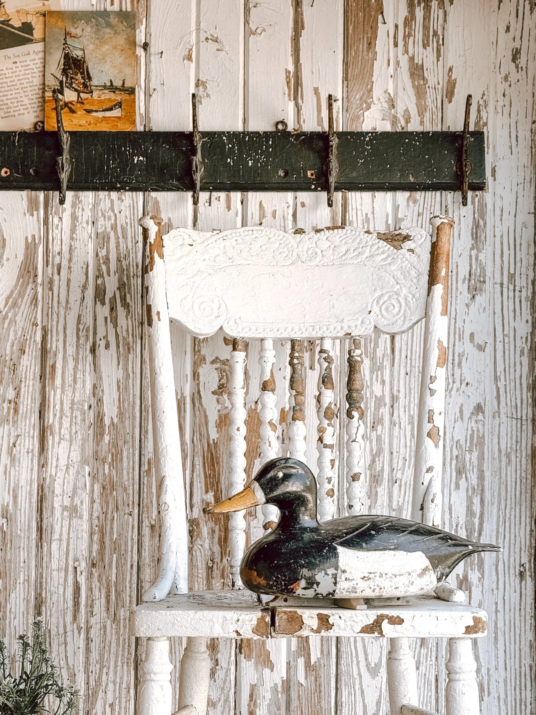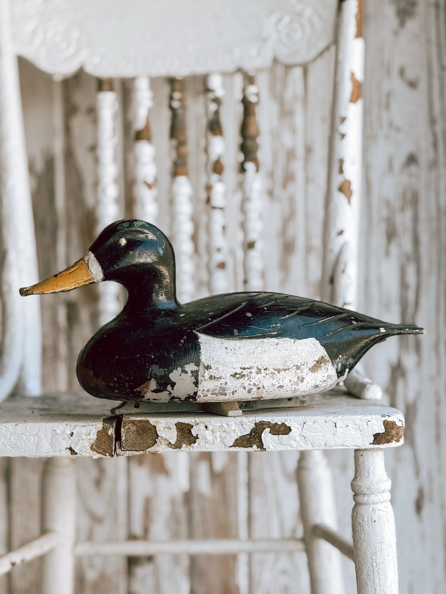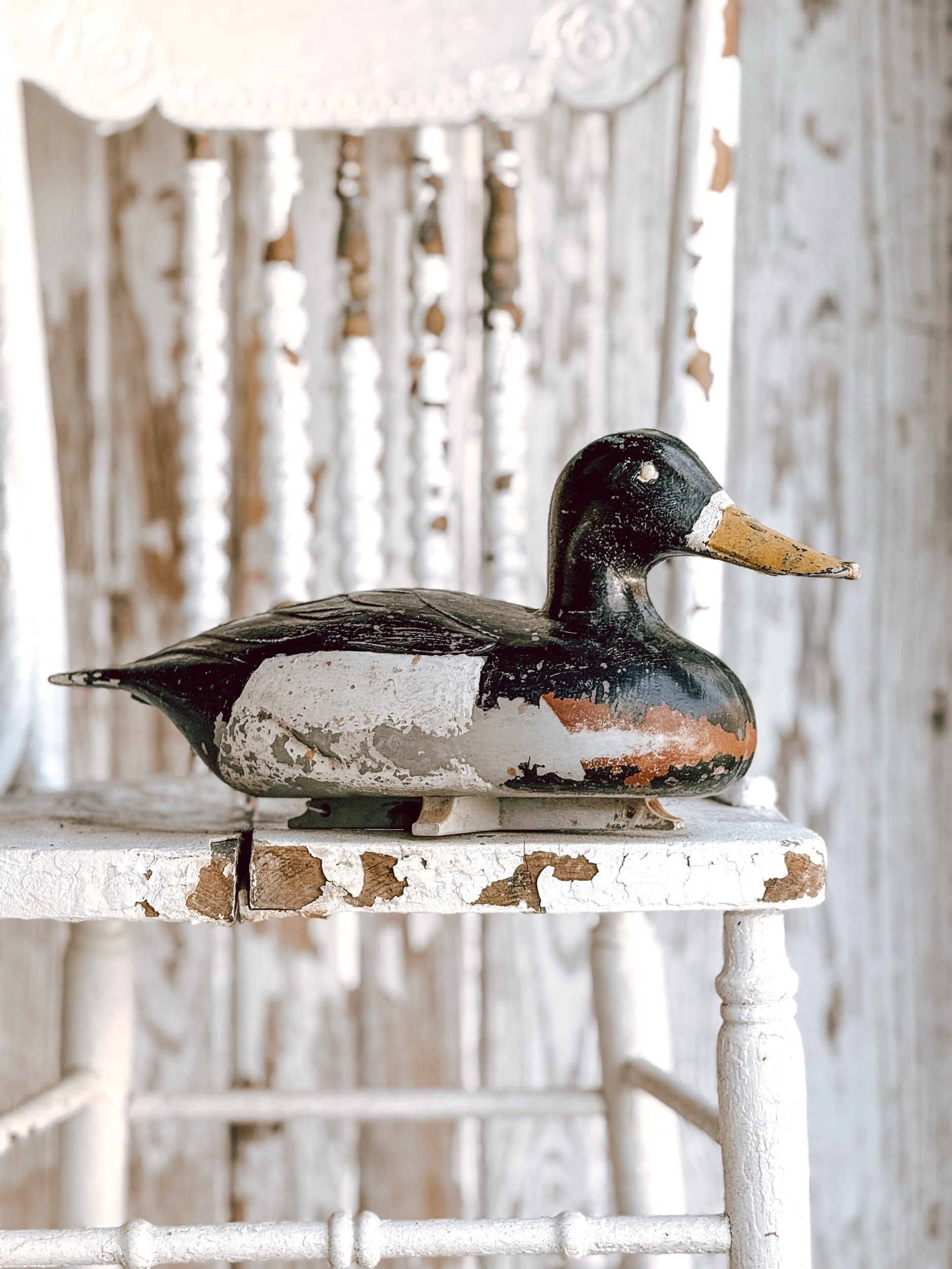 A beautifully timeworn antique duck decoy, aged to perfection with layers of original paint and patina that tell its story. The surface shows years of natural wear, revealing soft undertones and texture that make this piece truly one of a kind.