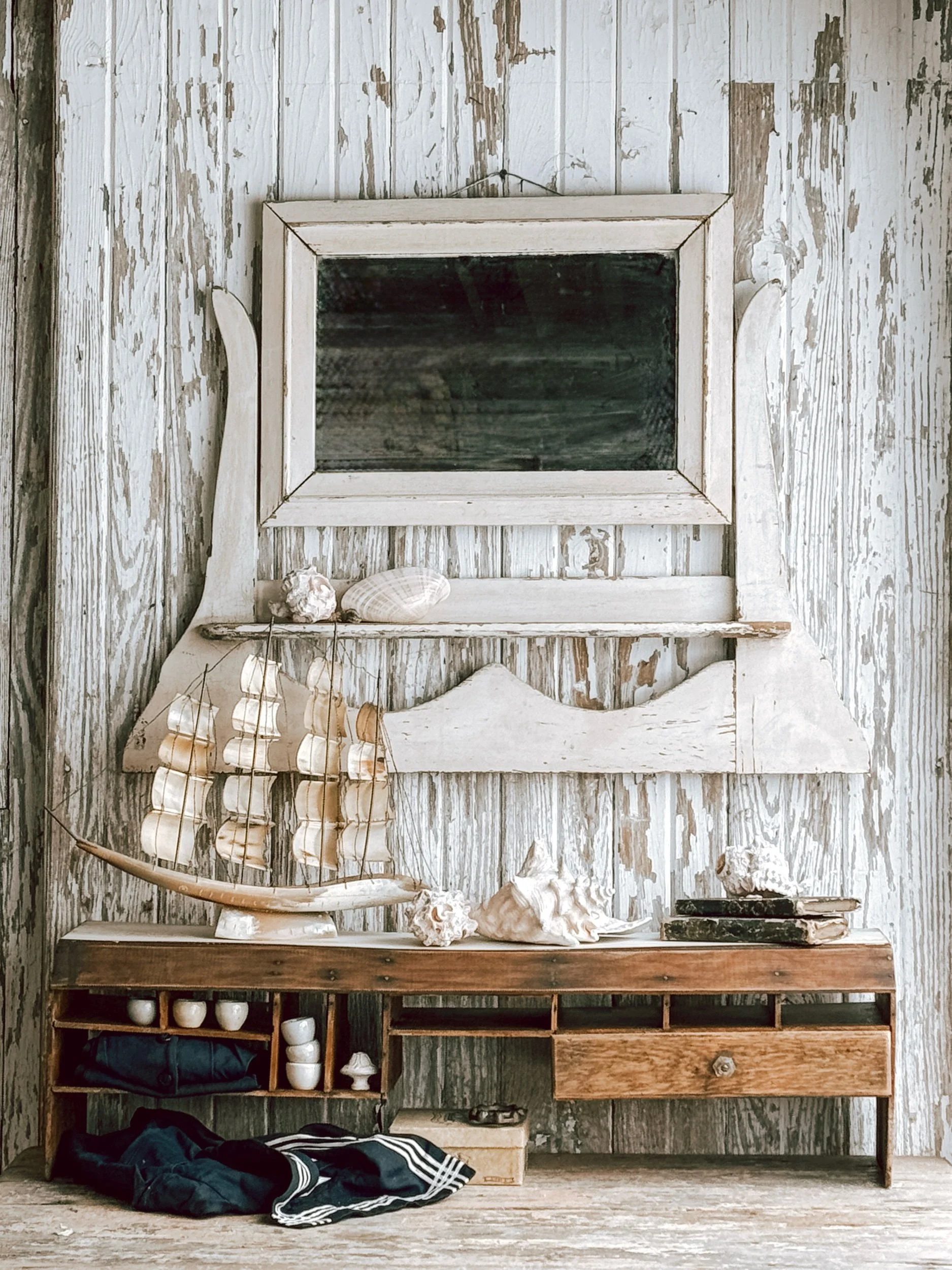 This aged cream mirror features a softly beveled mirror and the most charming lower shelf detail, framed by gently curved side supports and scalloped trim. The finish carries authentic aged patina with natural chippy areas that reveal its history and character.