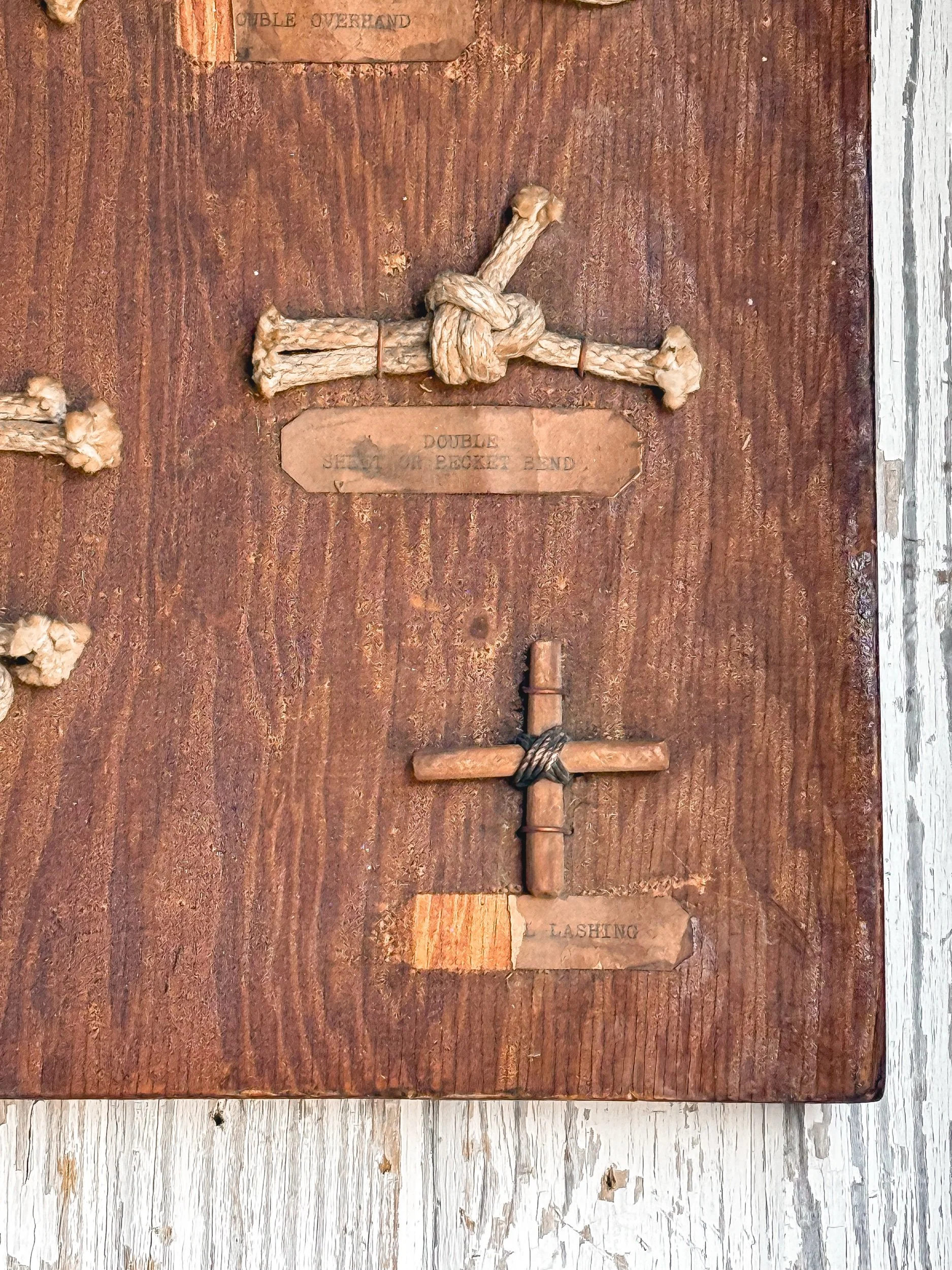 A wonderful vintage maritime knot instruction display, featuring a collection of traditional sailor’s knots mounted on a richly aged wooden board. Each rope knot is carefully tied and labeled, illustrating classic seamanship techniques used in maritime training.