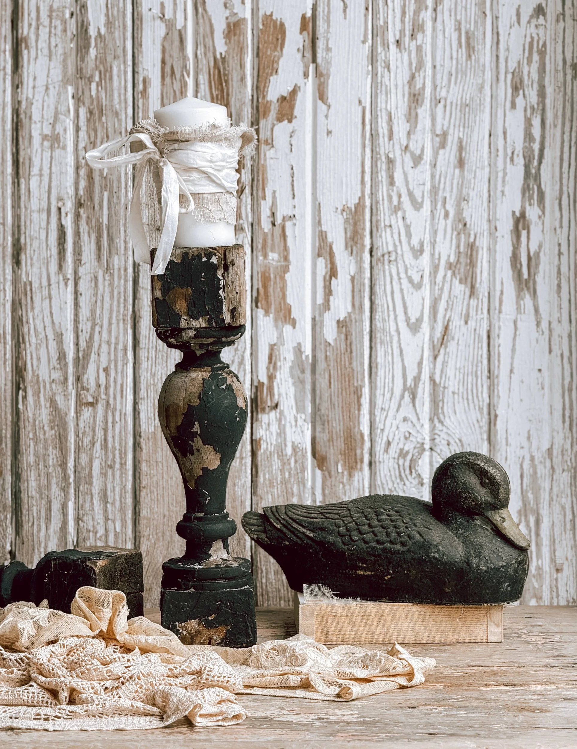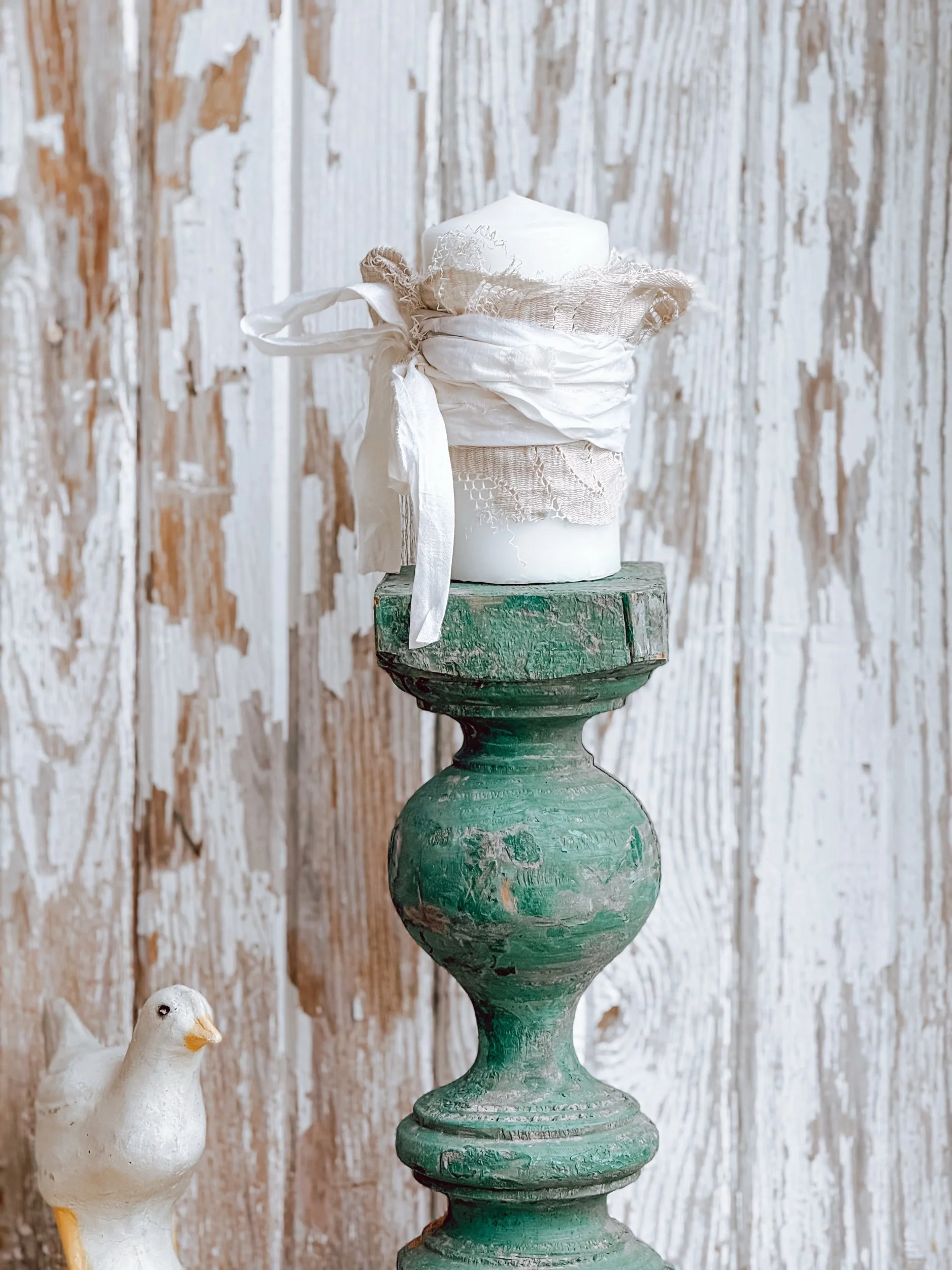 Topped with a pillar candle wrapped in antique French lace, this piece balances strength and delicacy — the chunky base grounded and substantial, the lace offering a soft, romantic contrast.