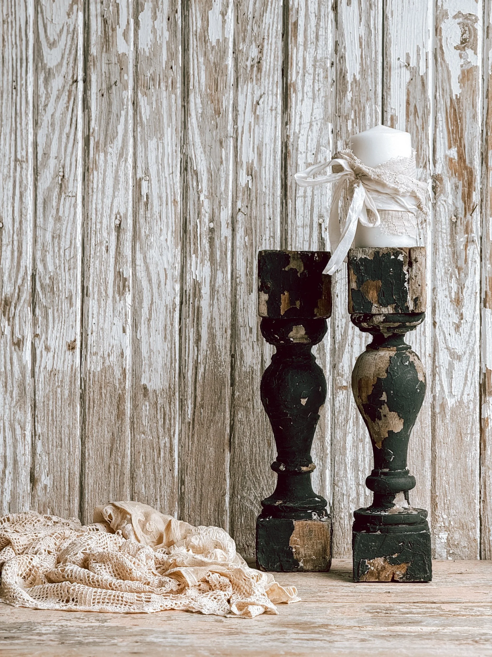 A striking antique salvaged candleholder finished in a rich, timeworn green with layers of beautifully aged patina. The sculptural, architectural form gives it presence, while the softened edges speak to its history and use over time.