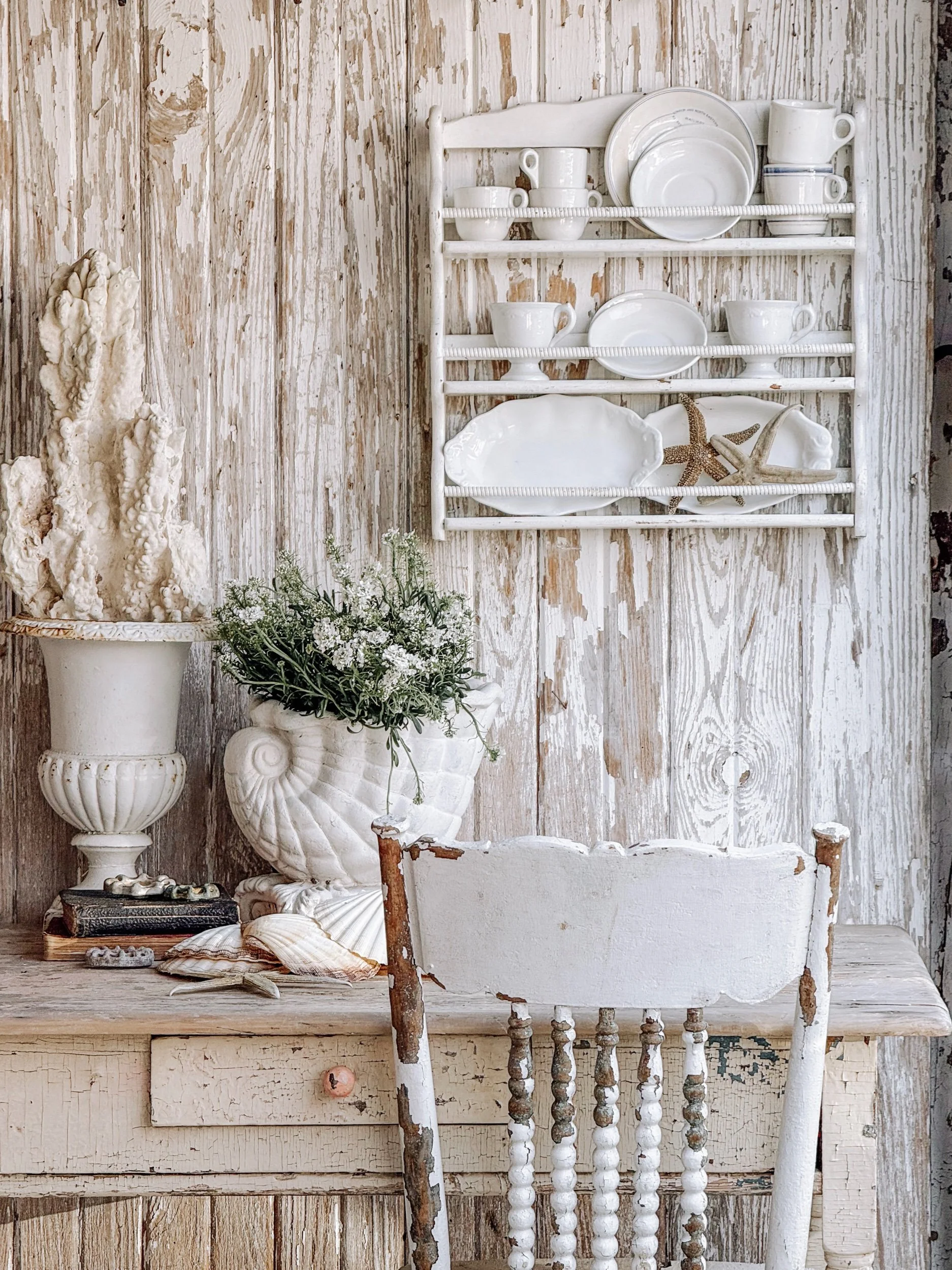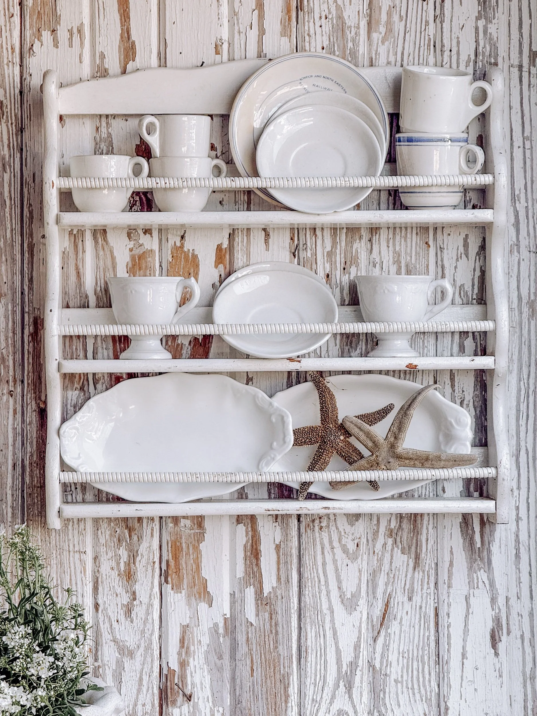 Style it with collected ironstone, café cups, or small plates, or lean into a coastal look with shells and found seaside treasures. It also makes a beautiful vertical moment on a wall, adding both texture and function to a space.
