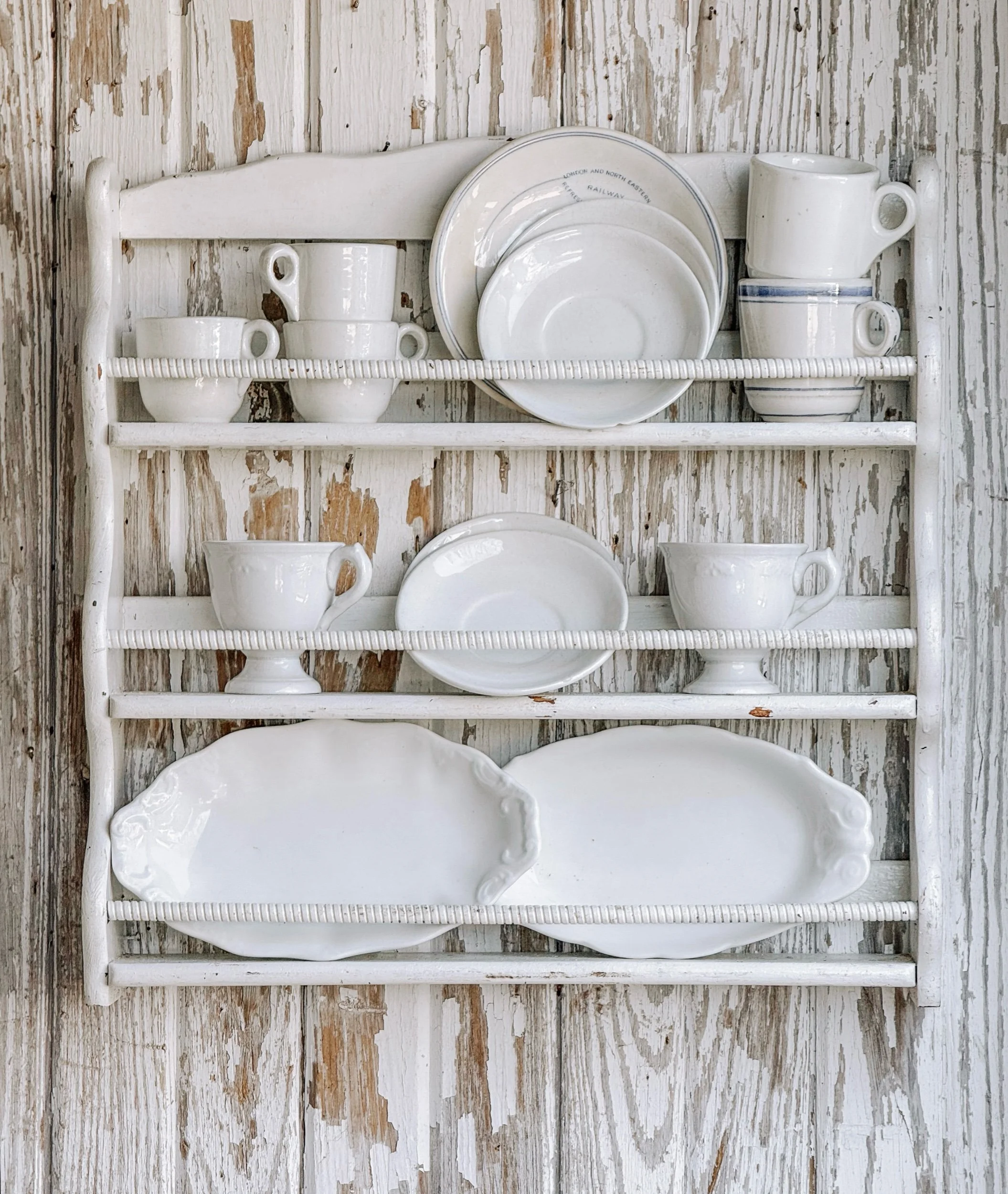 A charming antique European petite plate rack finished in a soft, creamy white with a beautifully aged patina. The scale is perfect—small enough to tuck into a kitchen, pantry, or garden shed, yet impactful in its presence.