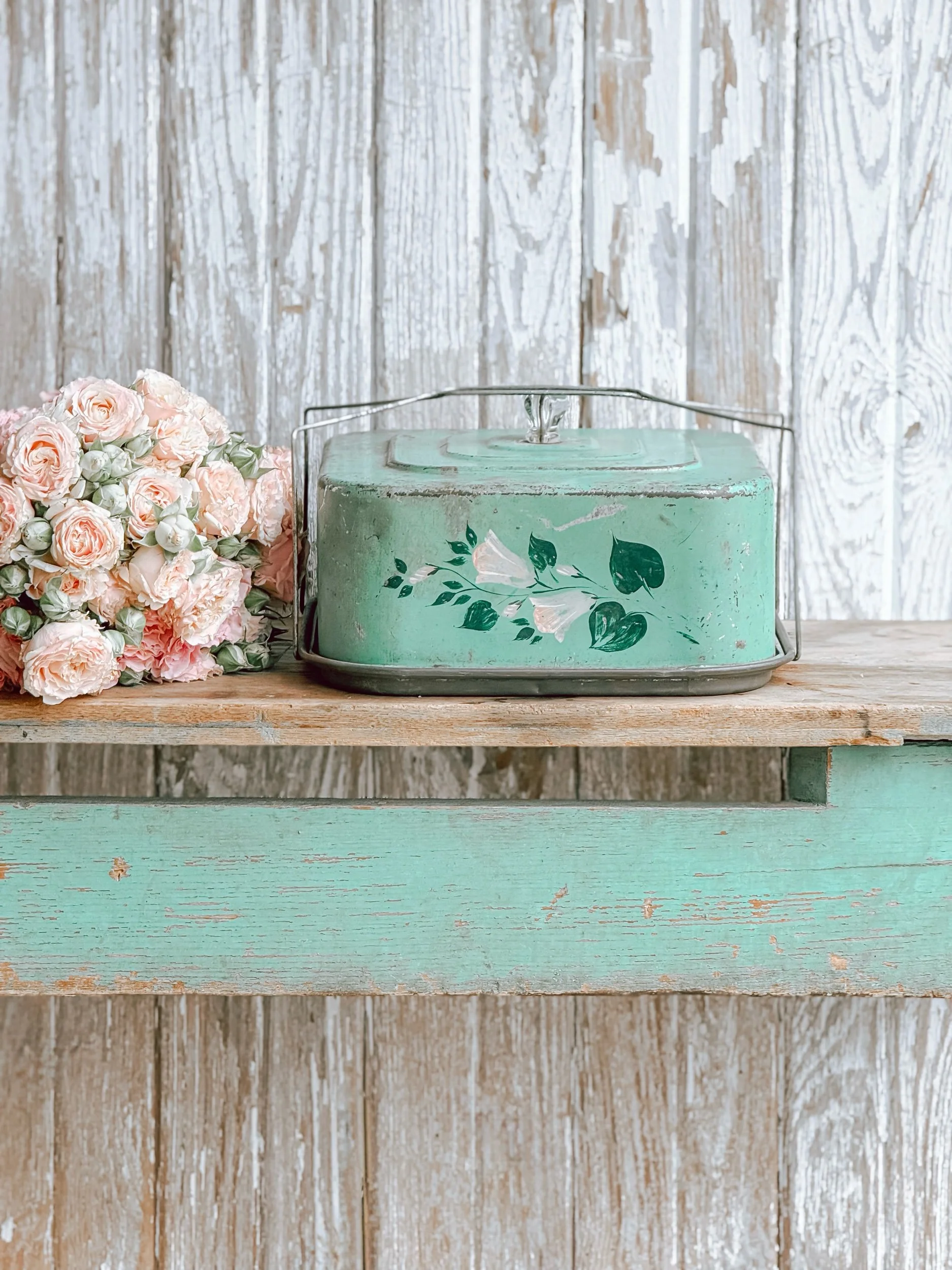 A beautifully aged antique cake tin in the loveliest soft green, featuring delicate hand-painted floral detailing across the front. The patina is perfectly worn, with subtle marks and fading that speak to years of use and care.