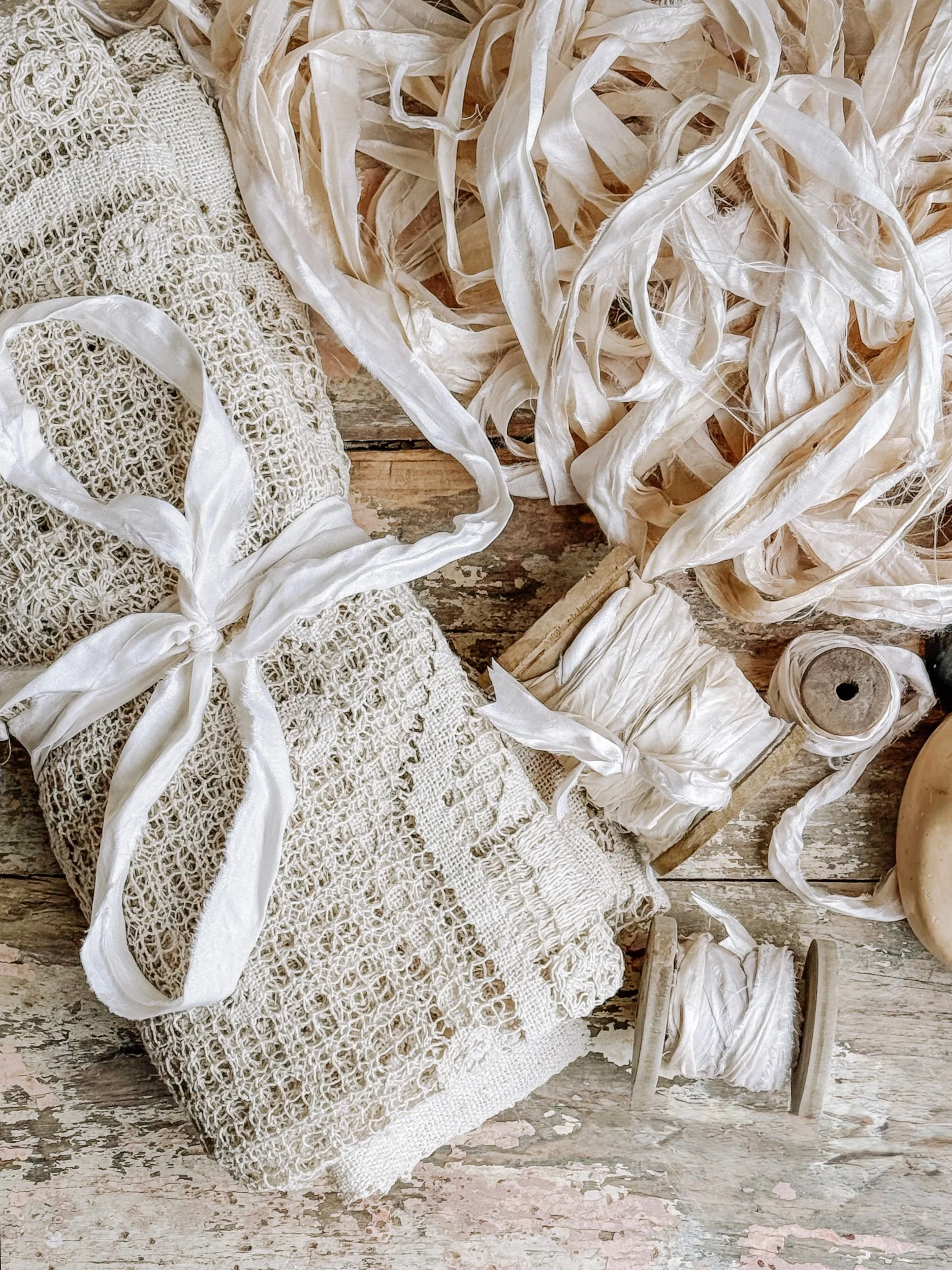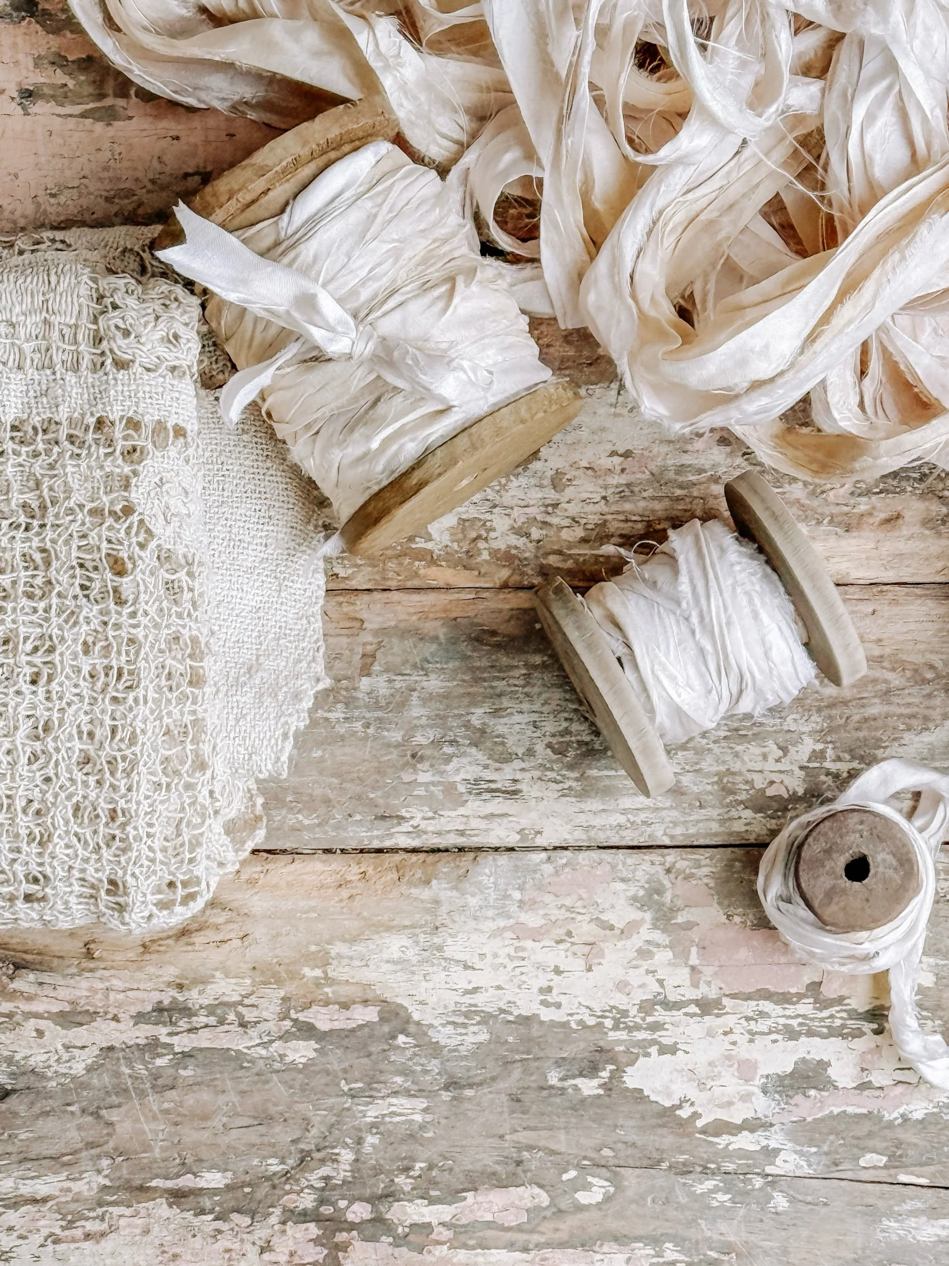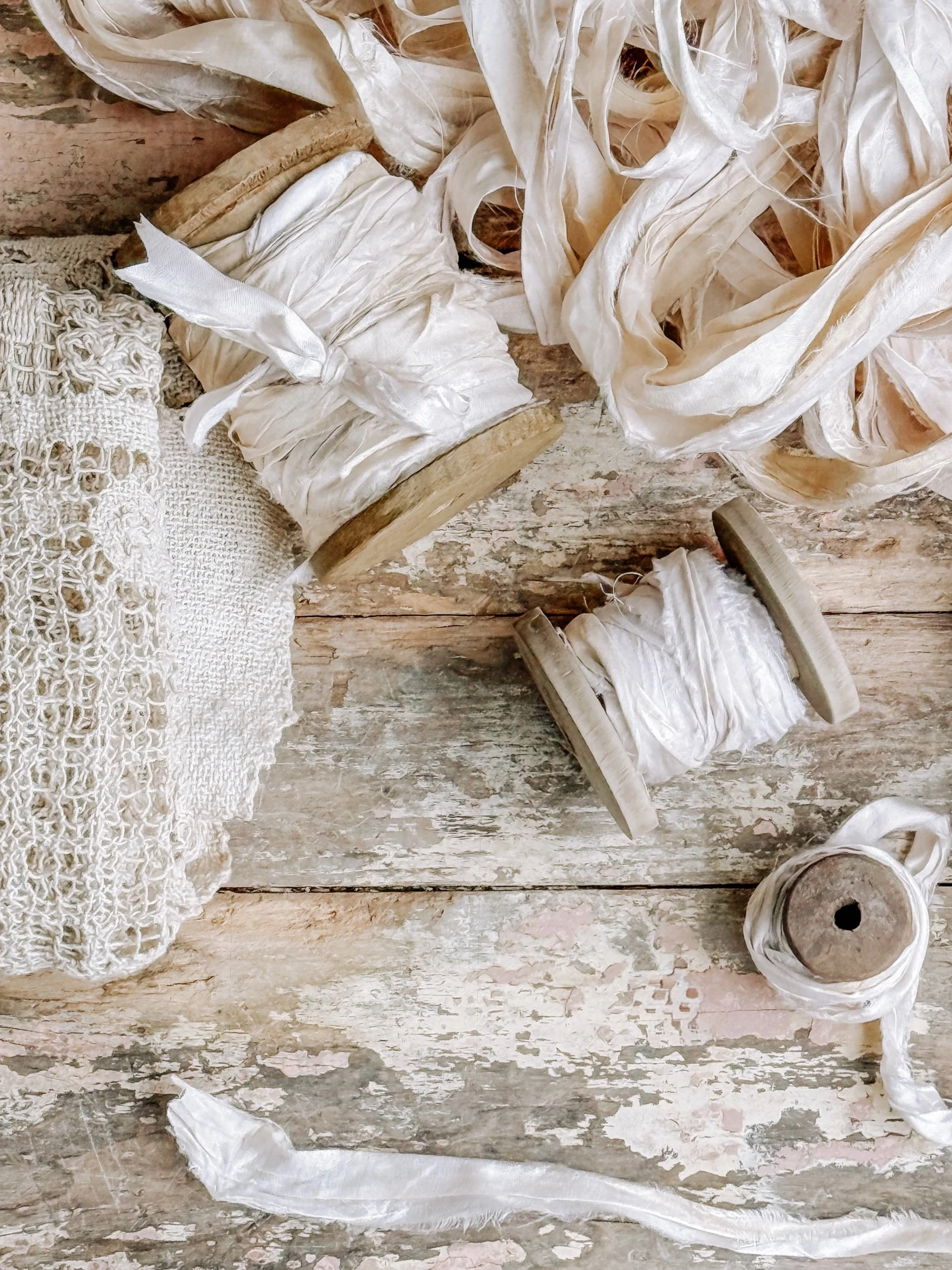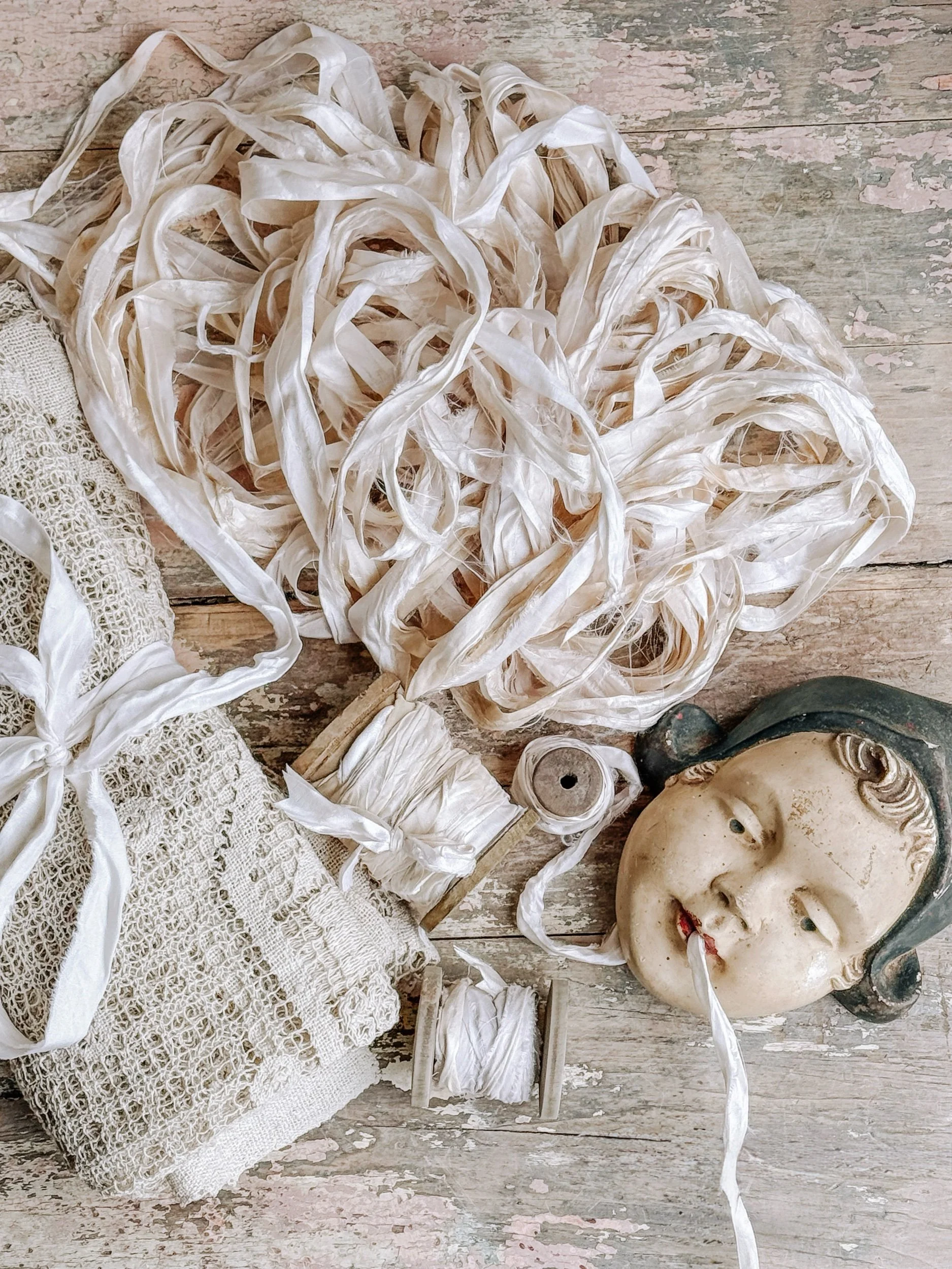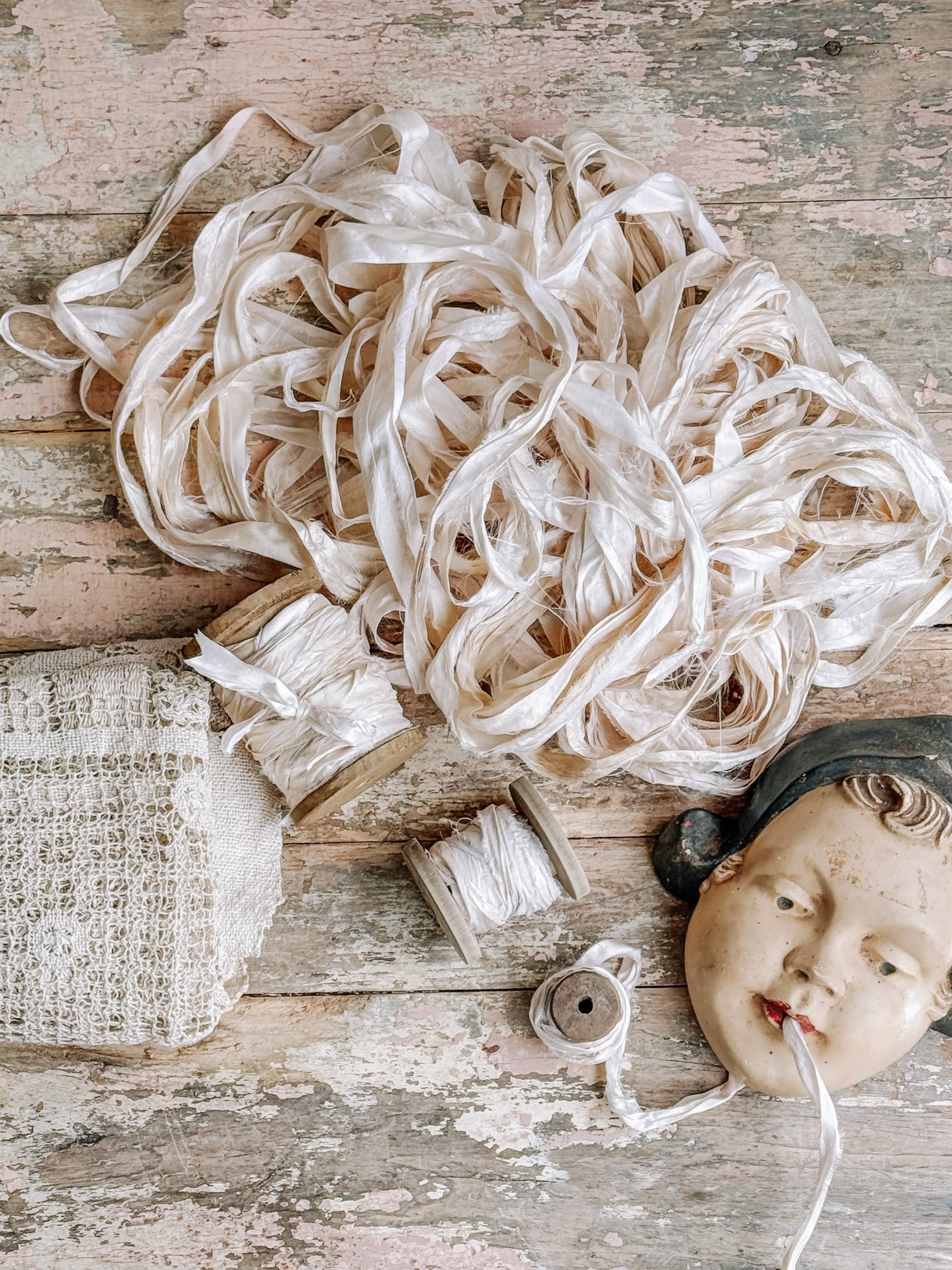 This collection includes three spools of recycled matte silk ribbon, each in a slightly varied width and tone. The subtle champagne warmth adds depth and softness, preventing the ribbons from feeling stark white and allowing them to layer beautifully with antique linens, ironstone, aged metals, and winter greens. Natural, softly frayed edges and a fluid drape give each ribbon an organic, lived-in quality.