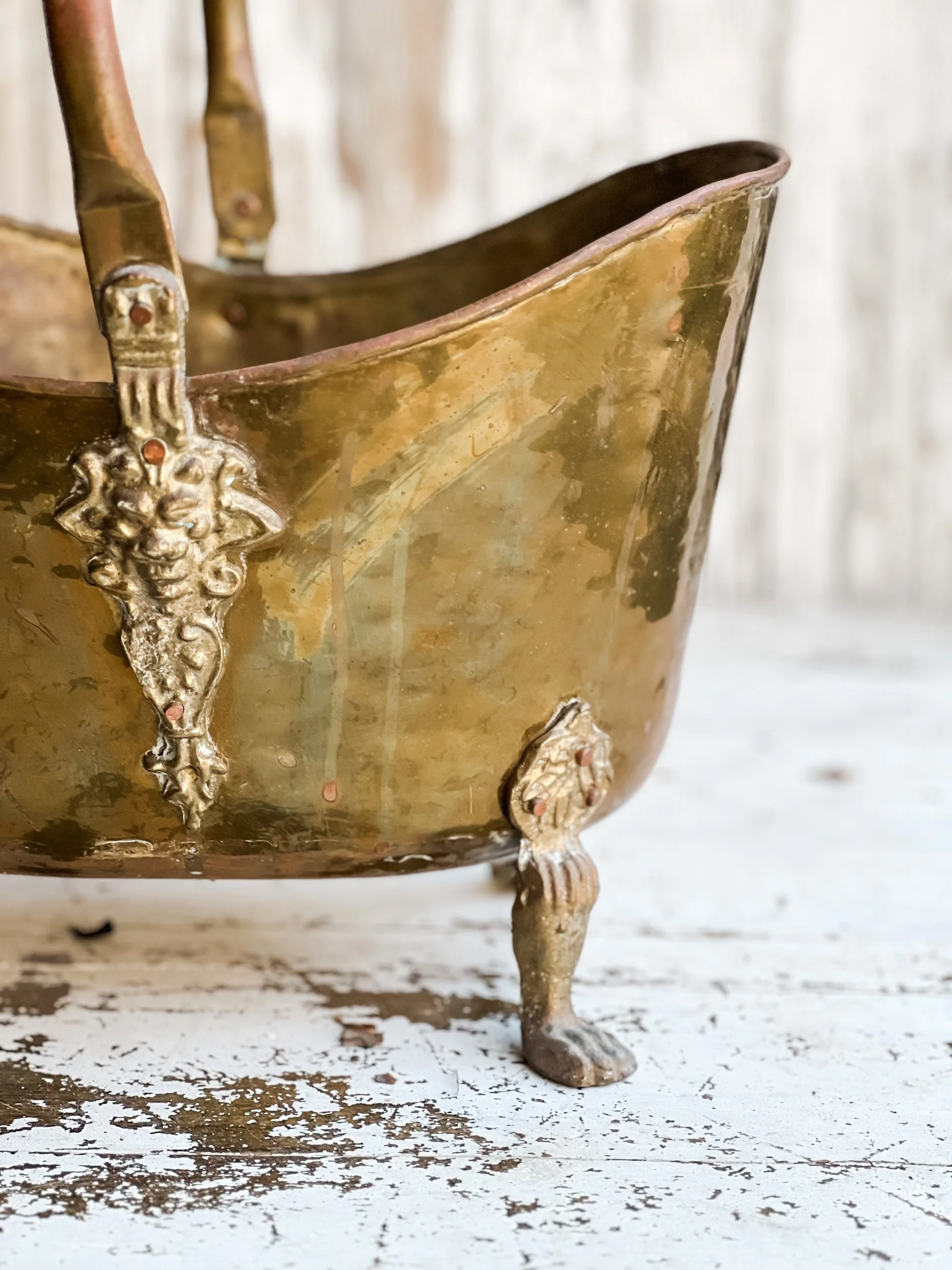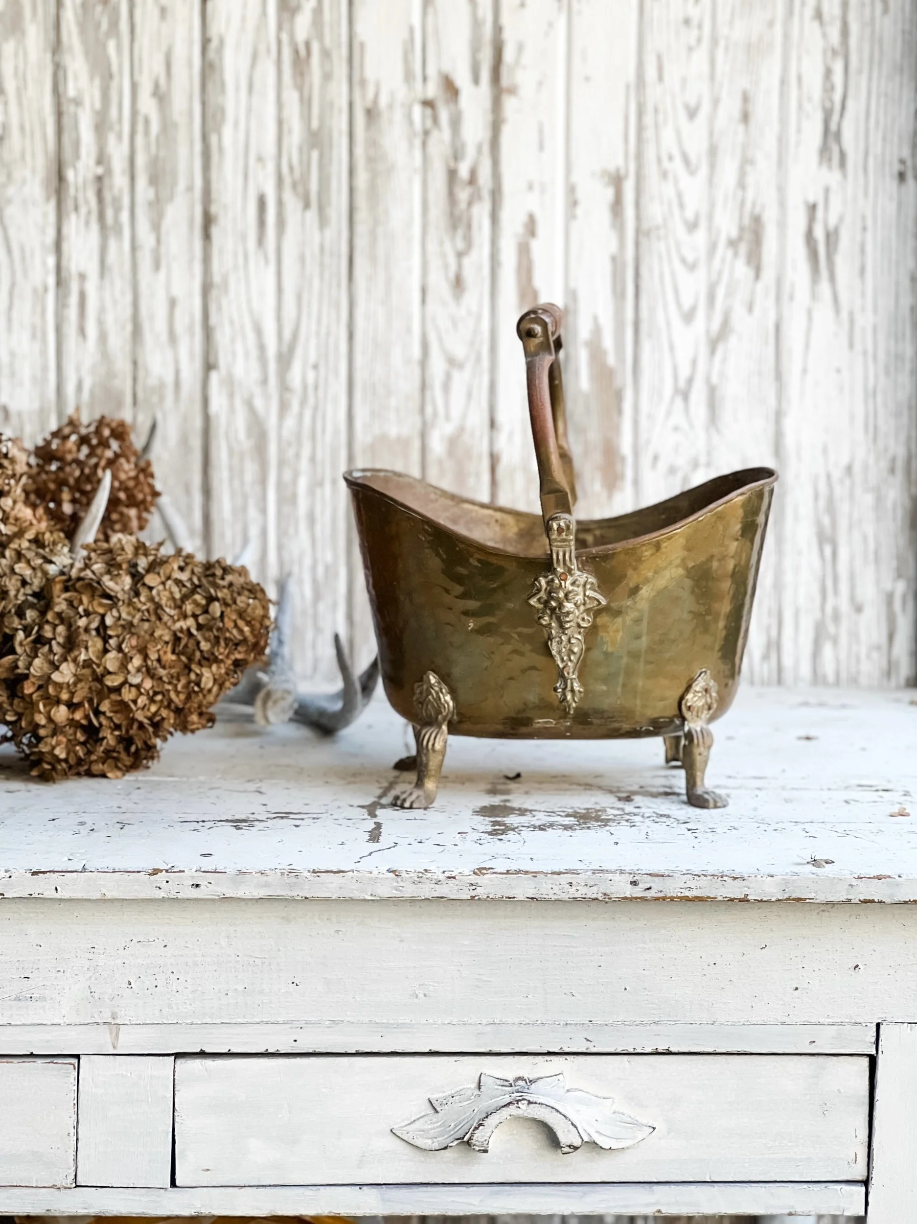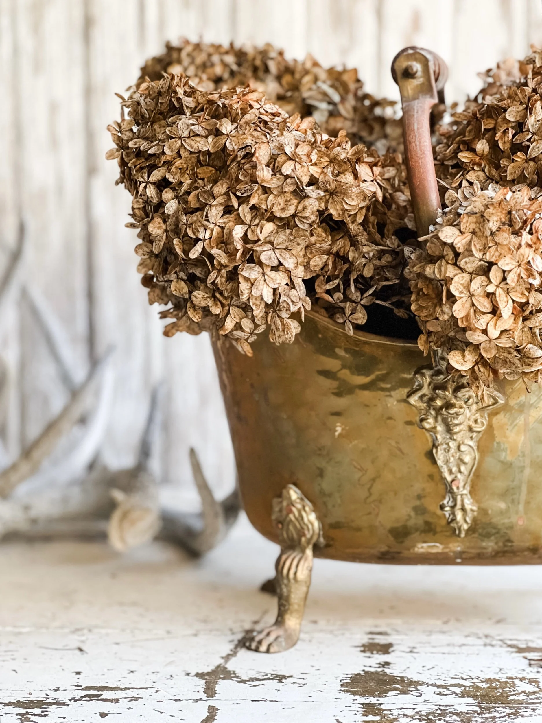 A beautiful antique brass caldron with amazing aged patina, making this a STUNNING display to pair with your favorite plants and seasonal florals in any vintage inspired space.
