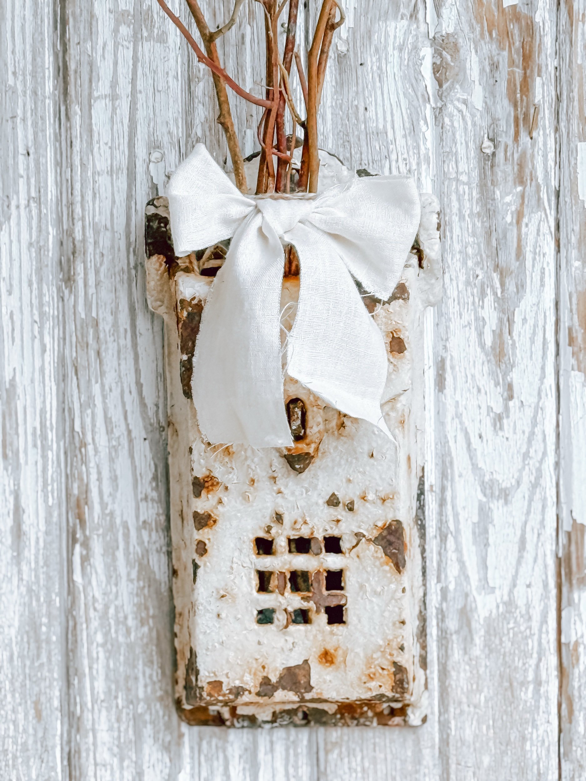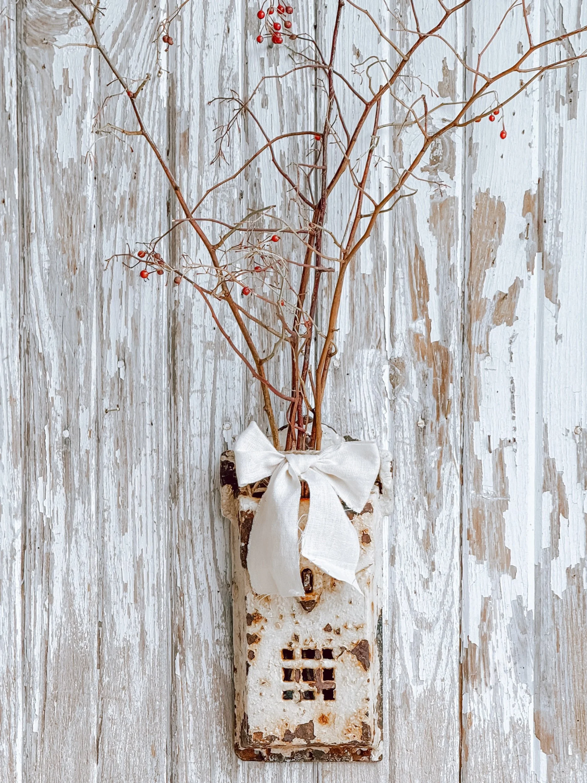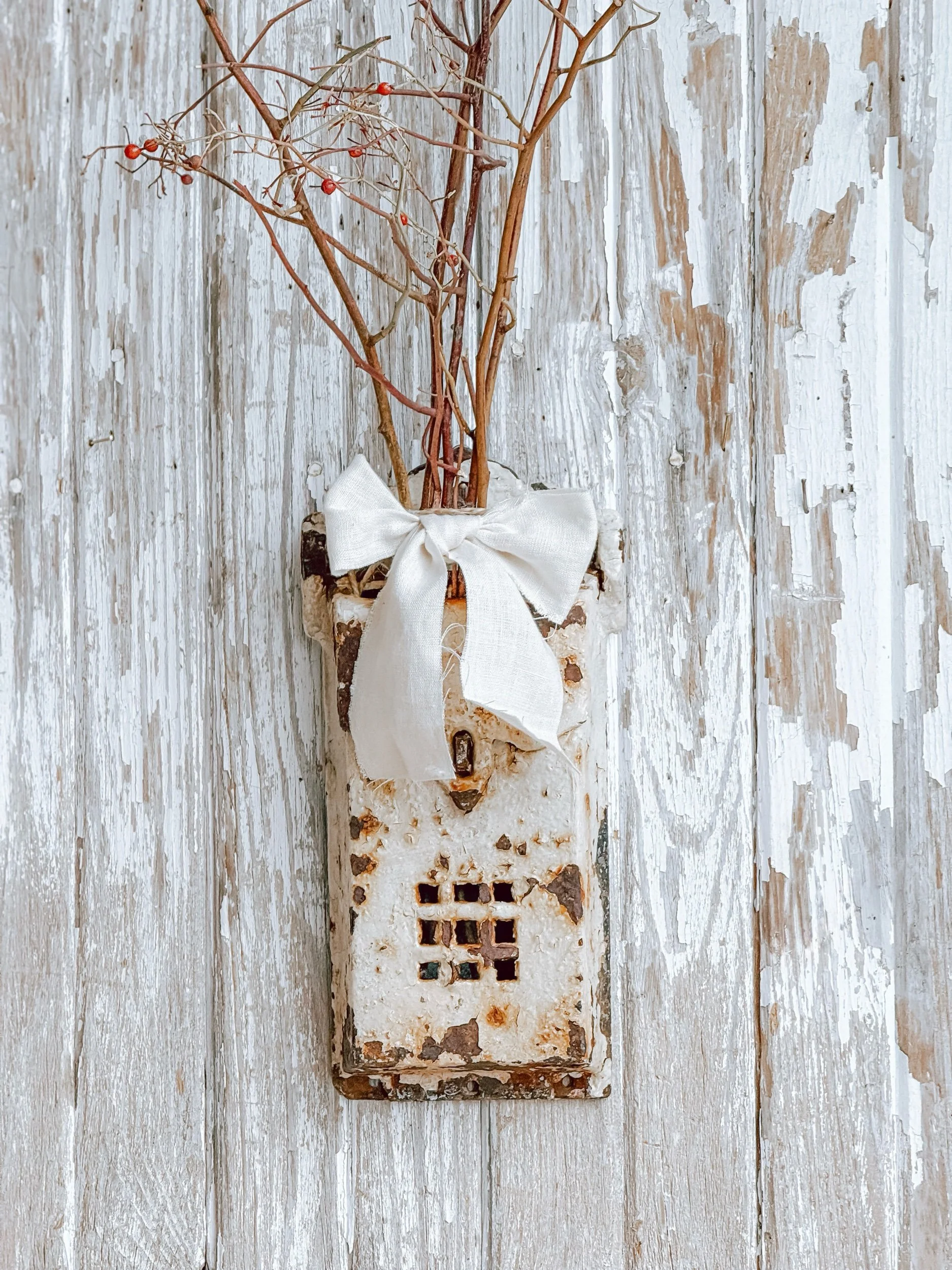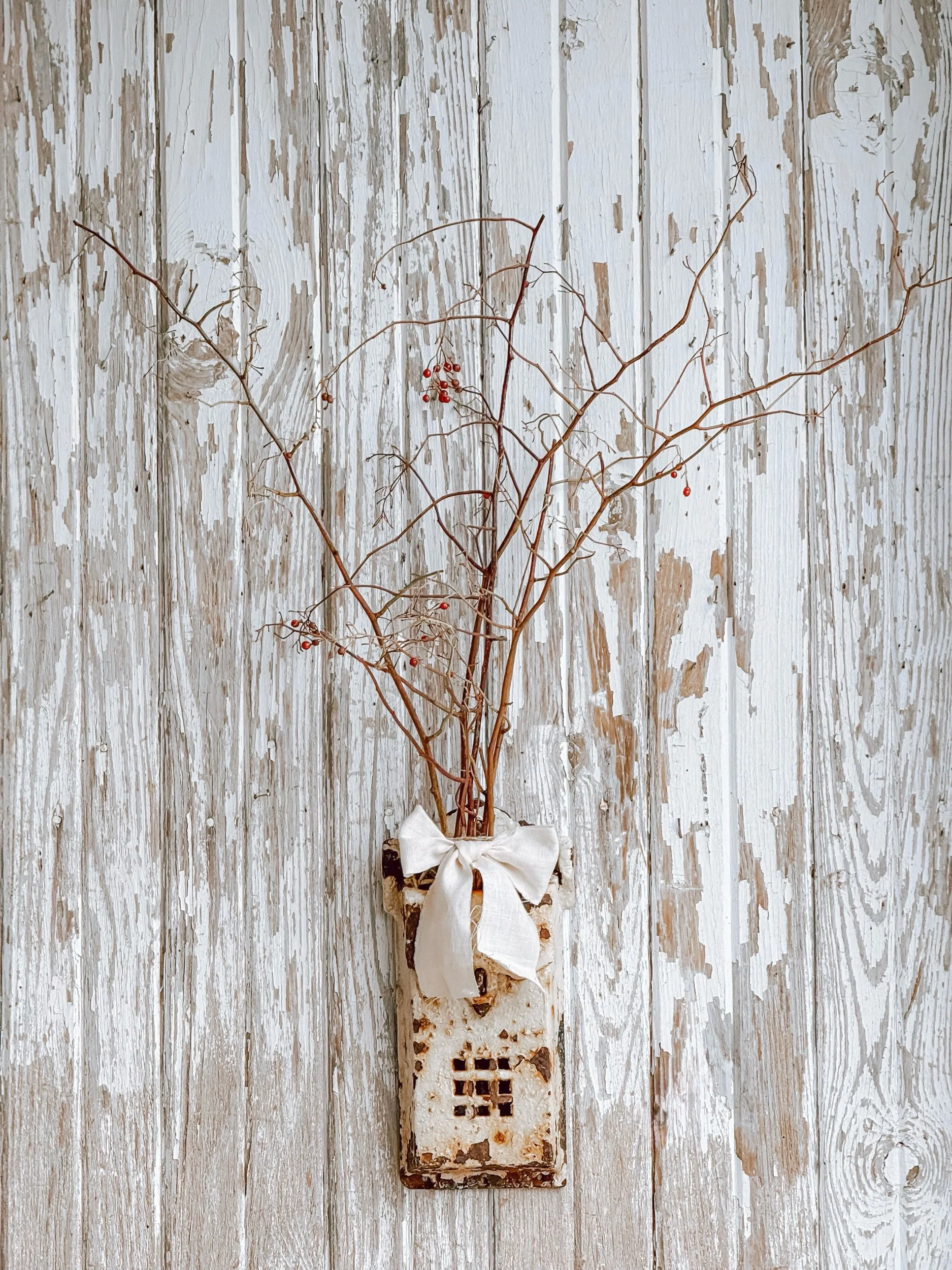 Finished with an artisan handmade bow, this piece is both functional and decorative. Style it with dried branches or seasonal florals, use it for mail or keepsakes, or let it stand alone as a sculptural wall piece. Its character-filled presence adds depth and quiet charm to any collected space.