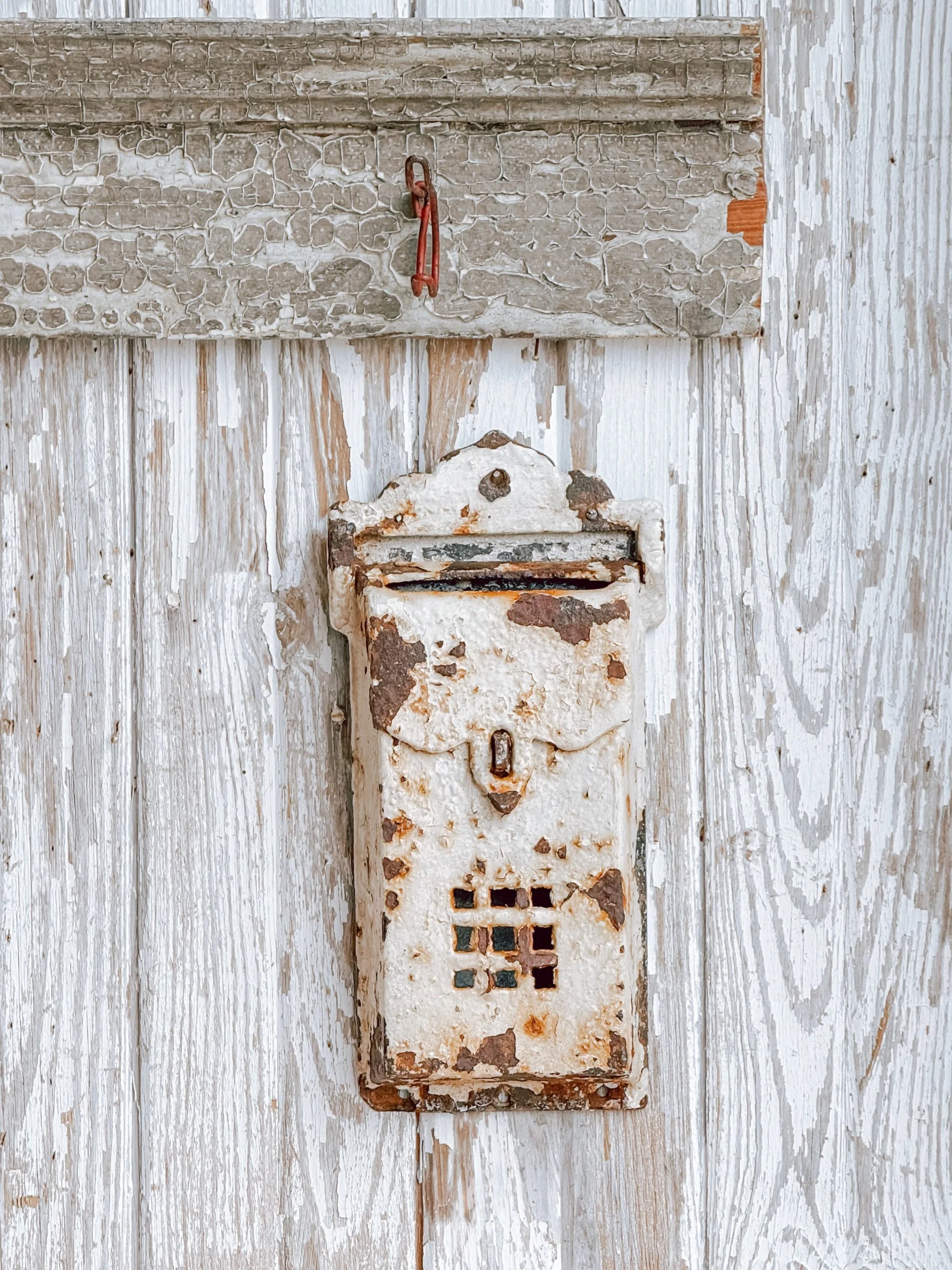 A beautifully timeworn antique salvaged mailbox with rich patina and layers of authentic wear. The surface shows peeling paint, soft rust, and old-world texture that tell the story of its past life, making it a striking architectural accent.